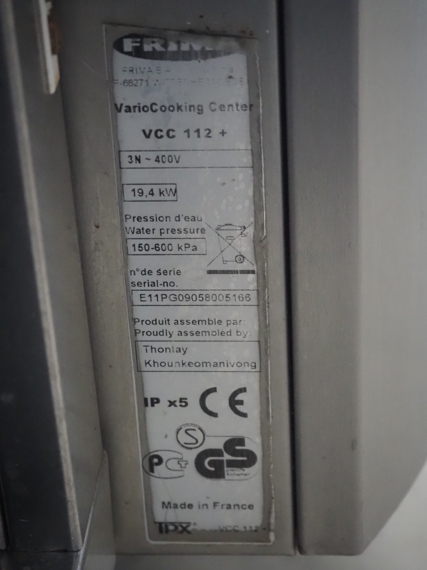 Frima VarioCooking Center, model: VCC 112+, serial number: E11PG09058005166, 400 V, 3 Ph, 19.4 kW, dimensions: 1200 mm x 800 mm x 1050 mm.