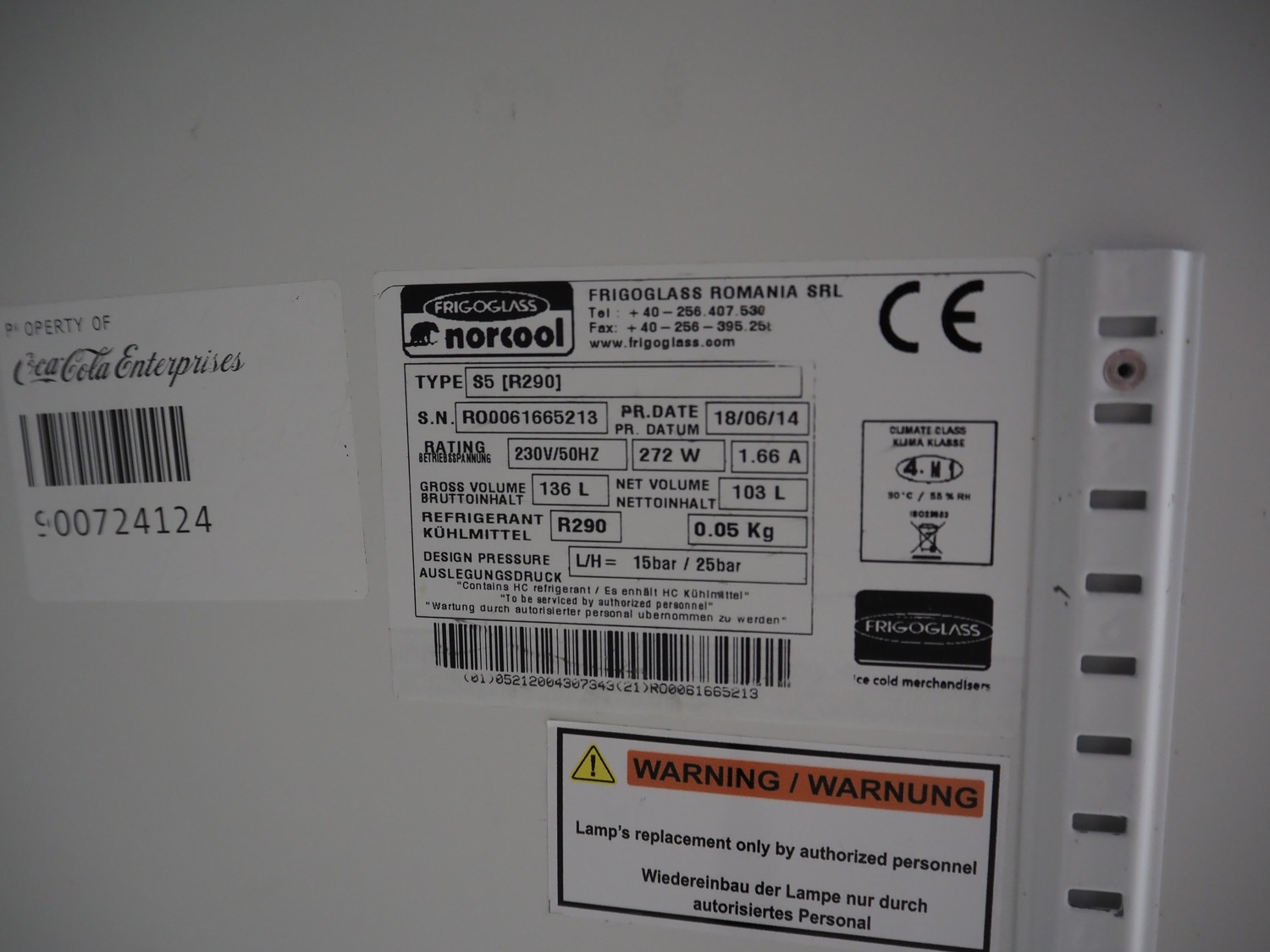 Frigoglass refrigerator, type: S5, serial number: RO0061665213, year of construction: 18/06/14, 230 V, 50 Hz, 1.66 A, 272 W, refrigerant: R290 / 0.05 kg, volume: 103 liter, dimensions: 600 mm x 500 mm x 890 mm. Technical condition unknown.