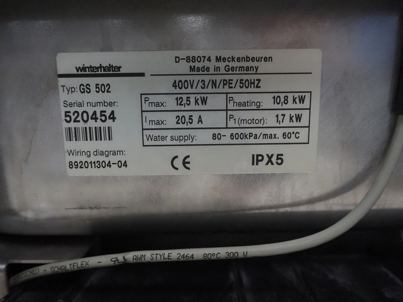 Winterhalter dishwasher, model: GS 502, serial number: 520454, 400 V, 3 Ph, 50 Hz, 20.5 A, 10.8 kW, clearance: 500 mm x 500 mm, total dimensions: 800 mm x 740 mm x 1530 mm.