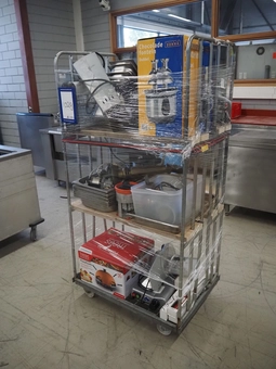 Steel trolley with large amount of restaurant inventory, among others: pizza oven, Elite slicer, Prima Donna chocolate fountain.6 bidsLot is closed