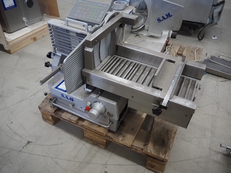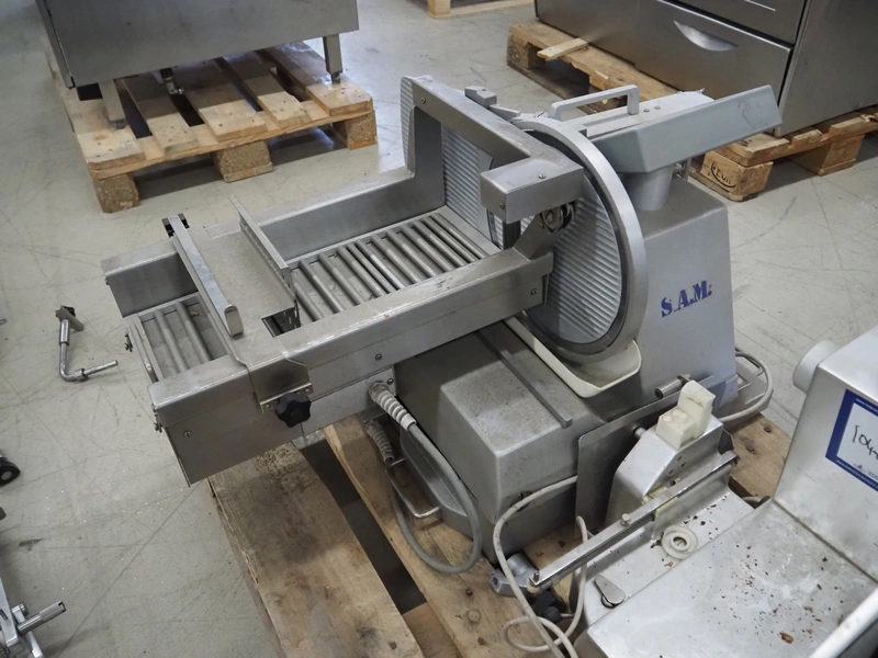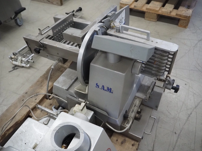S.A.M. automatic slicer, model: S.A.M. 329 f, serial number: 17064, year of construction: 1998, 400 V, 50 Hz, 1.36 A, dimensions: 940 mm x 600 mm x 500 mm.