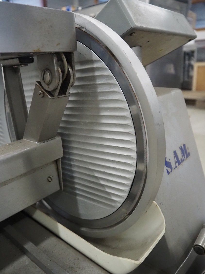 S.A.M. automatic slicer, model: S.A.M. 329 f, serial number: 17064, year of construction: 1998, 400 V, 50 Hz, 1.36 A, dimensions: 940 mm x 600 mm x 500 mm.