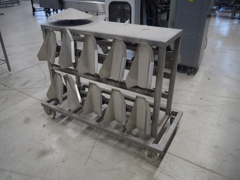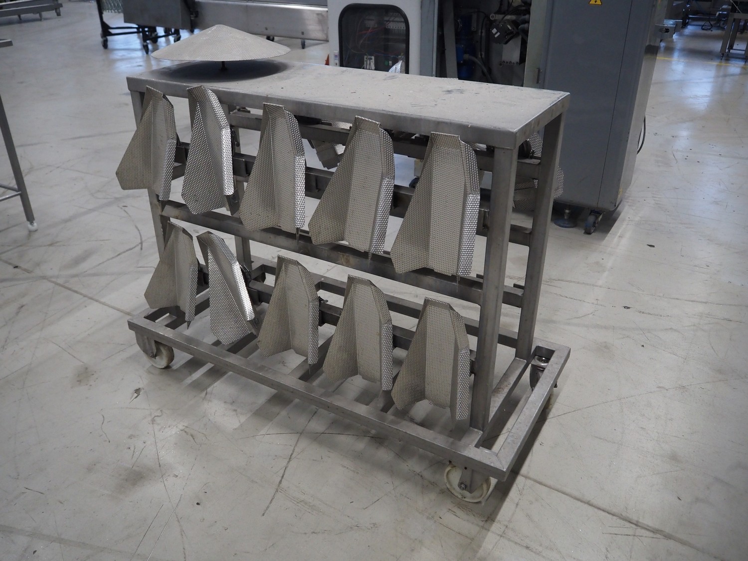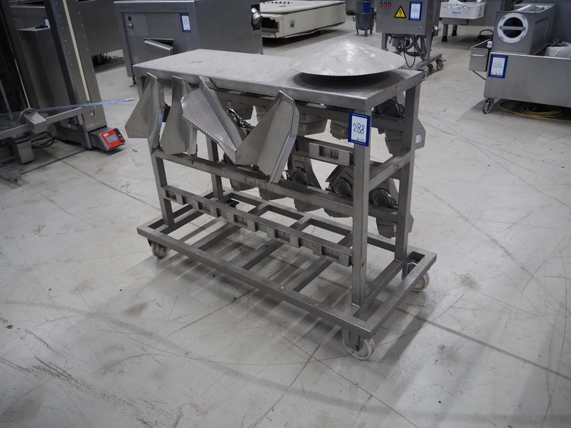S/s trolley with parts for multihead weigher, dimensions: 1350 mm x 600 mm x 1100 mm.