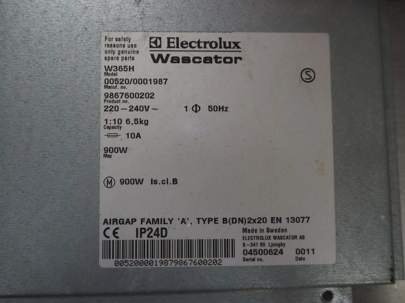 Electrolux washing machine, model: W365H, serial number: 04500624, 220/240 V, 1 Ph, 50 Hz, 10 A, 900 W, capacity: 6.5 kg, total dimensions: 720 mm x 680 mm x 1155 mm.