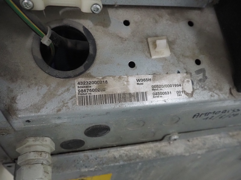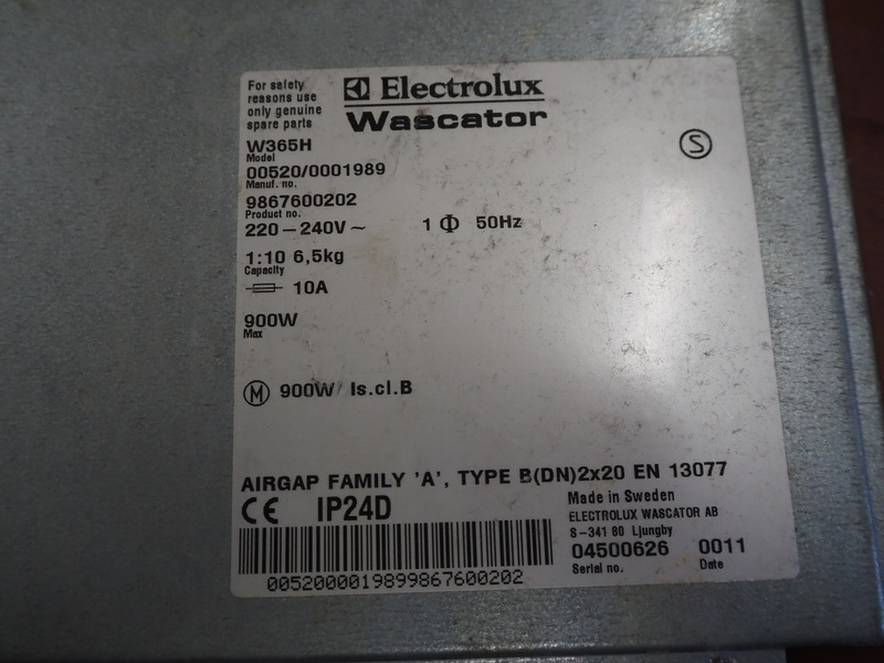 Electrolux washing machine, model: W365H, serial number: 04500626, 220/240 V, 1 Ph, 50 Hz, 10 A, 900 W, capacity: 6.5 kg, total dimensions: 720 mm x 680 mm x 1155 mm.
