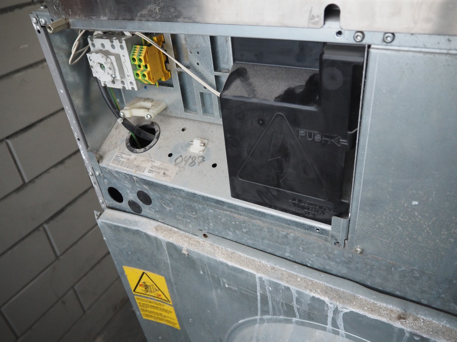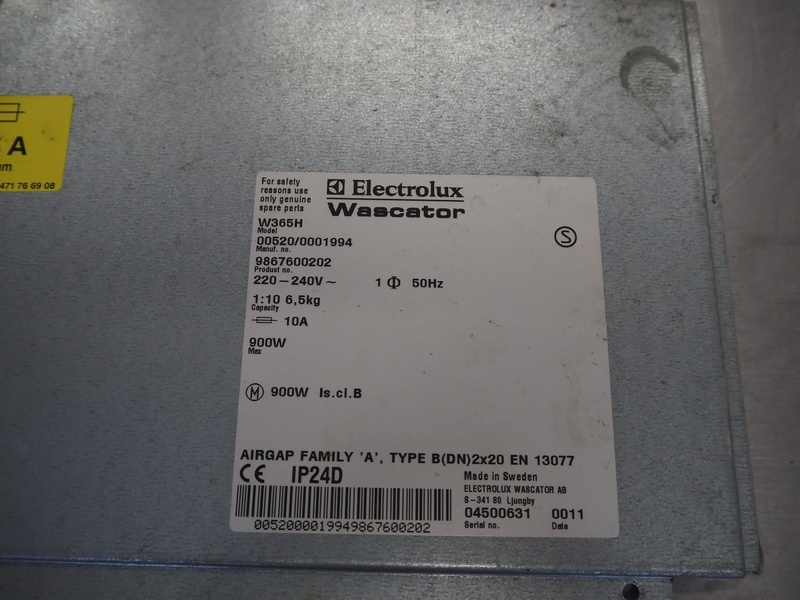 Electrolux washing machine, model: W365H, serial number: 04500631, 220/240 V, 1 Ph, 50 Hz, 10 A, 900 W, capacity: 6.5 kg, dimensions: 740 mm x 840 mm x 1220 mm.