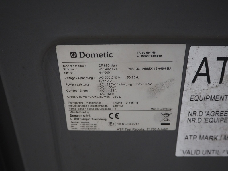 Dometic refrigerated container for vans, model: CF 850 Van, serial number: 4440001, 220-240 V, 50-60 Hz, 1.33 A, 360 W, refrigerant: R134a, 0.135 kg, volume: 850 liter, GEA evaporator, dimensions: 1400 mm x 1100 mm x 1000 mm.