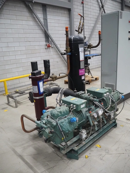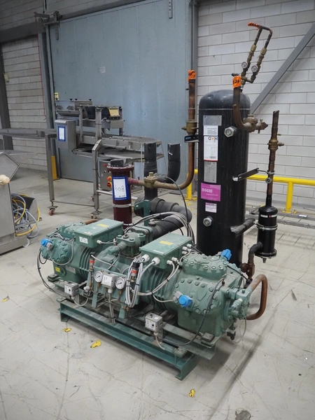 Bitzer Kühlmaschinenbau GmbH shock cooling installation for 40 m², consisting of: Bitzer Kühlmaschinenbau GmbH compressor rack with twin cooling compressor, type: 6GE-34Y-40P, capacity: 127/153 m³ per hour, dimensions compressor rack: 1700 mm x 1100 mm x 1650 mm, switch cabinet, dimensions switch cabinet: 1000 mm x 450 mm x 2000 mm.