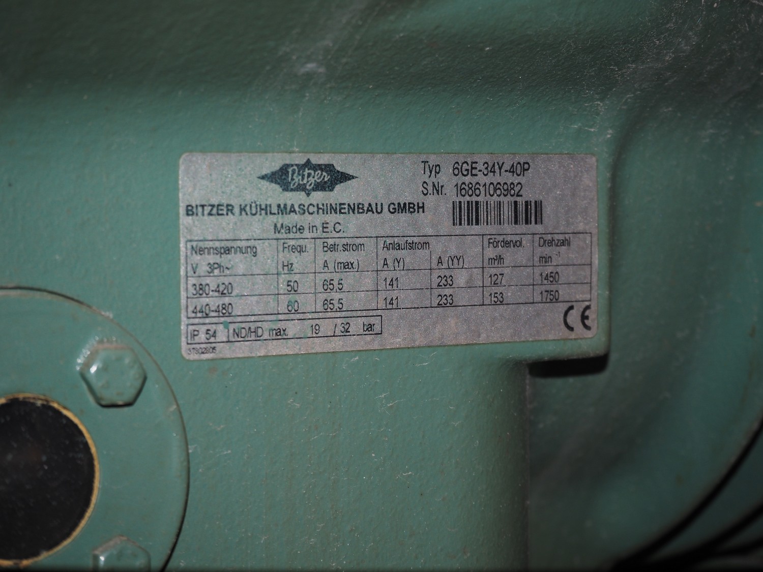 Bitzer Kühlmaschinenbau GmbH shock cooling installation for 40 m², consisting of: Bitzer Kühlmaschinenbau GmbH compressor rack with twin cooling compressor, type: 6GE-34Y-40P, capacity: 127/153 m³ per hour, dimensions compressor rack: 1700 mm x 1100 mm x 1650 mm, switch cabinet, dimensions switch cabinet: 1000 mm x 450 mm x 2000 mm.