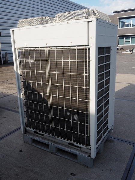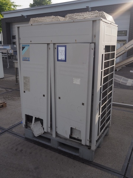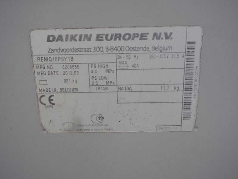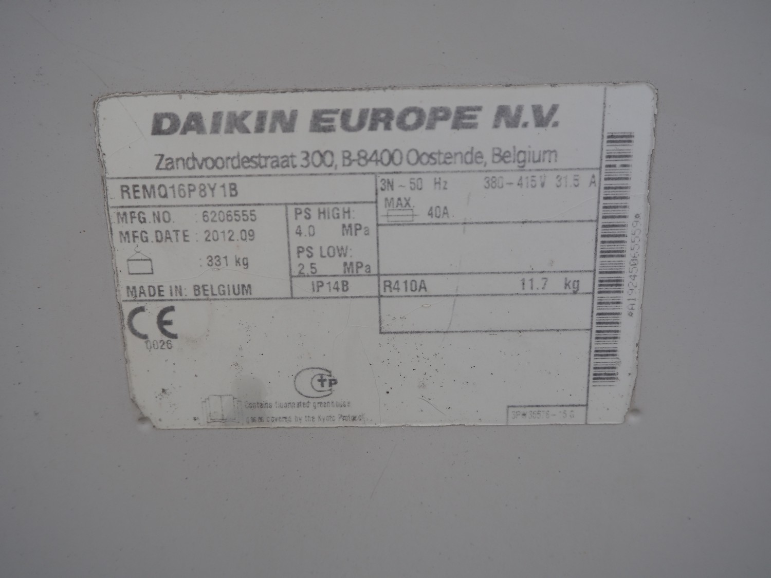 Daikin roof condenser, type: REMQ16P8Y1B, year of construction: 09/2012, 380-415 V, 3 Ph, 50 Hz, refrigerant: R410A, 2 fans, dimensions: 1250 mm x 780 mm x 1700 mm.