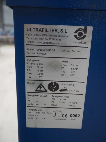 Donaldson water chiller, model: ultracool 0040 SP, serial number: 42915/06, year of construction: 2006, 230 V, 1 Ph, 50 Hz, 2.0 kW, refrigerant: R134a/2.0 kg, dimensions: 590 mm x 710 mm x 1120 mm.