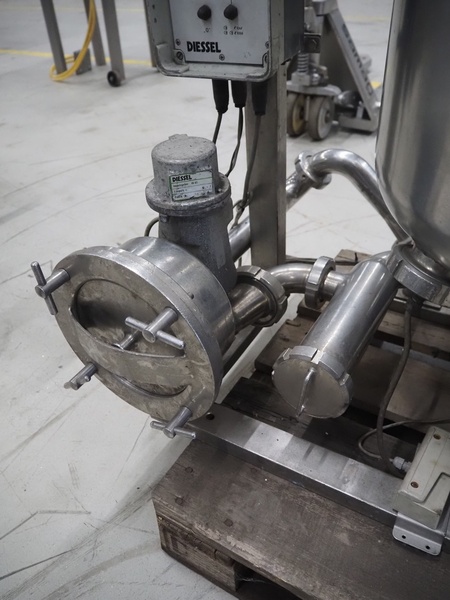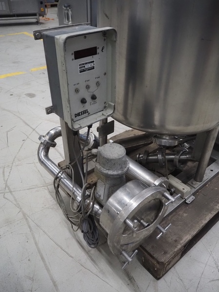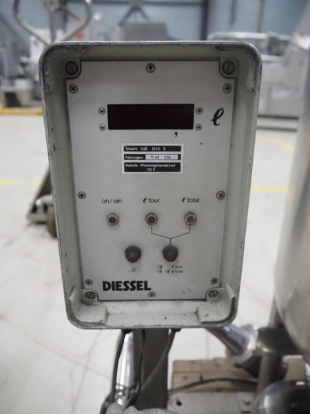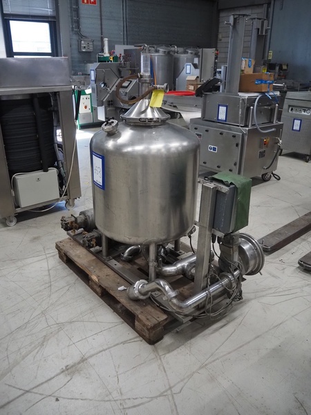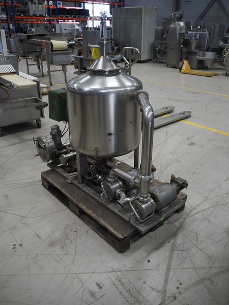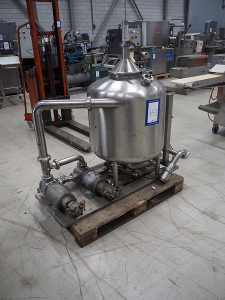 SCHWARTE milk reception unit, with 2 hydraulic self-priming pumps, air eliminator, flow meter, milk filter and interconnecting piping, capacity: 30000 liter per hour, CIP cleanable, inside dimensions: Ø 600 mm x 600 mm, total dimensions: 1500 mm x 800 mm x 1050 mm.