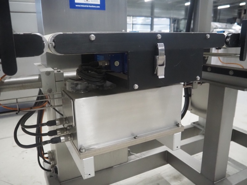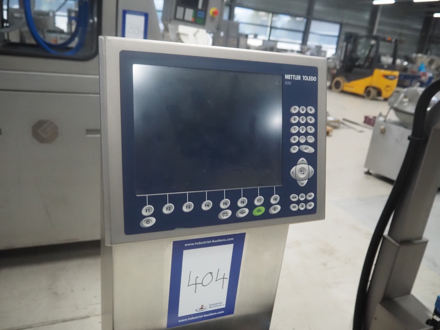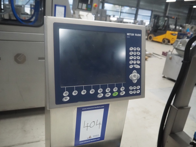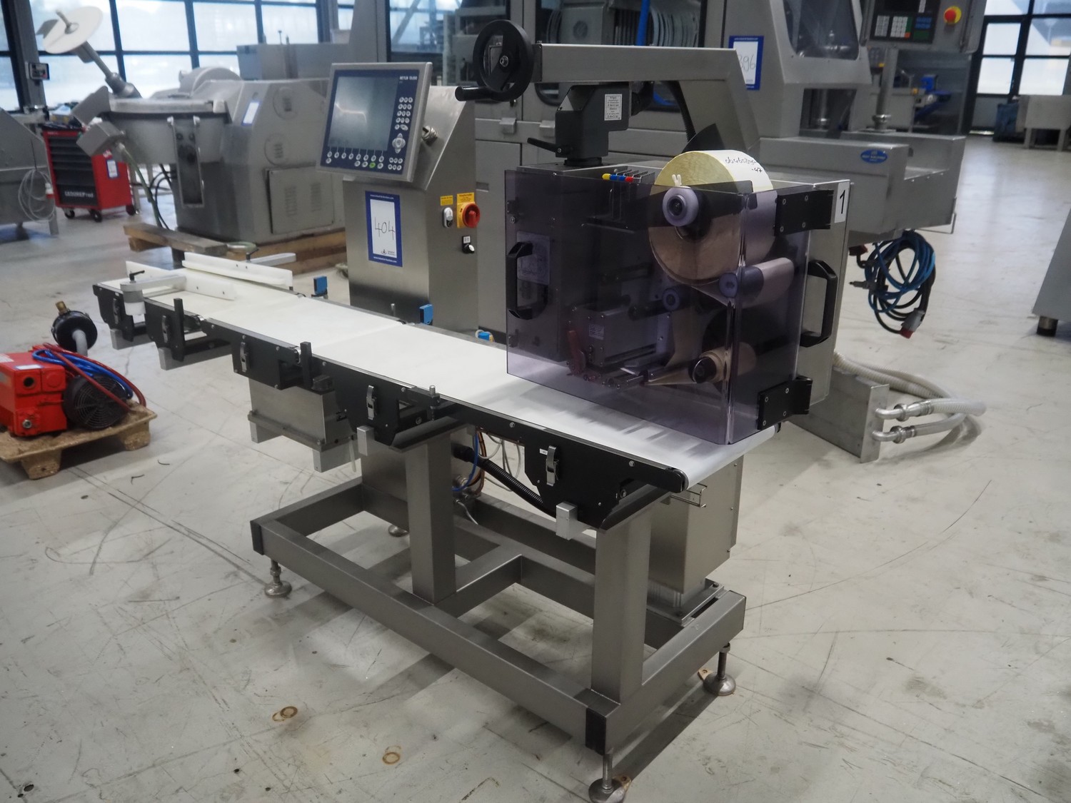 Mettler-Toledo Garvens GmbH checkweigher with labeller, type checkweigher: PAS 3012, serial number: 17000505, year of construction: 2007, 230 V, 50 Hz, maximum: 7.5 kg, minimum: 0.020 kg, e=: 0.001 kg, d=: 0.001 kg, T=-: 7.5 kg, plastic belt, belt width: (3x) 300 mm, total dimensions: 2250 mm x 850 mm x 730 mm.