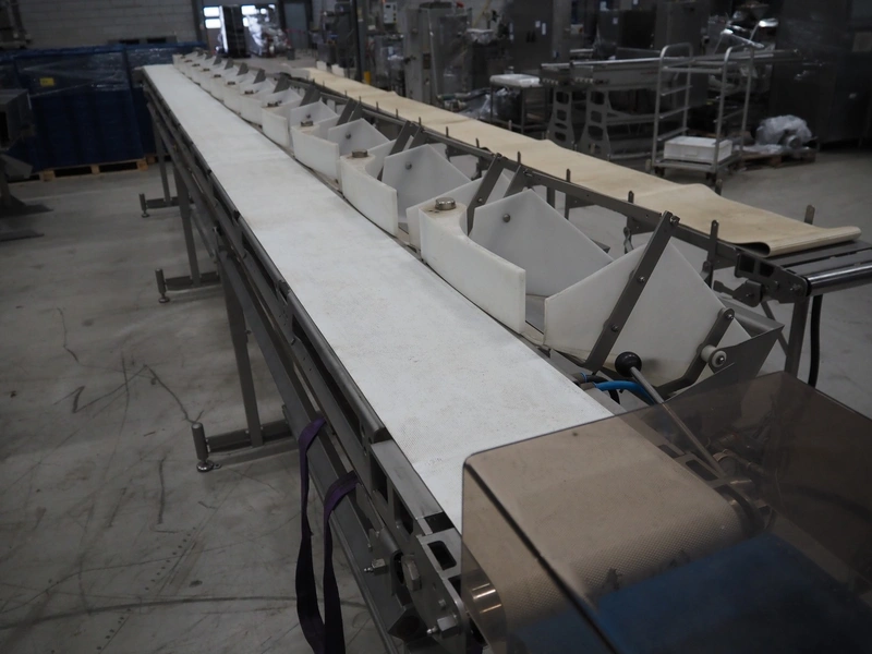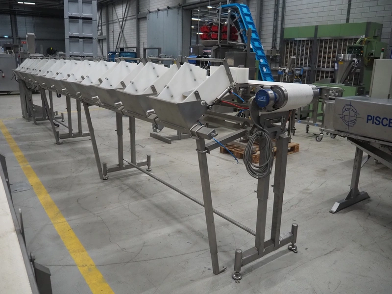 Scanvaegt weighing and sorting line, type: 4717.275.10, serial number: BOE00095, year of construction: 2006, 400 V, 3 Ph, 50/60 Hz, 16.0 A, s/s frame, plastic belts, belt width: 260 mm, 12 rejecters, total dimensions: 1000 mm x 800 mm x 1750 mm and 7200 mm x 1100 mm x 1600 mm.