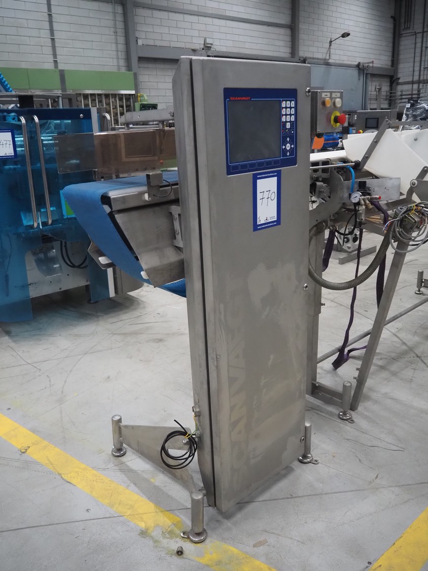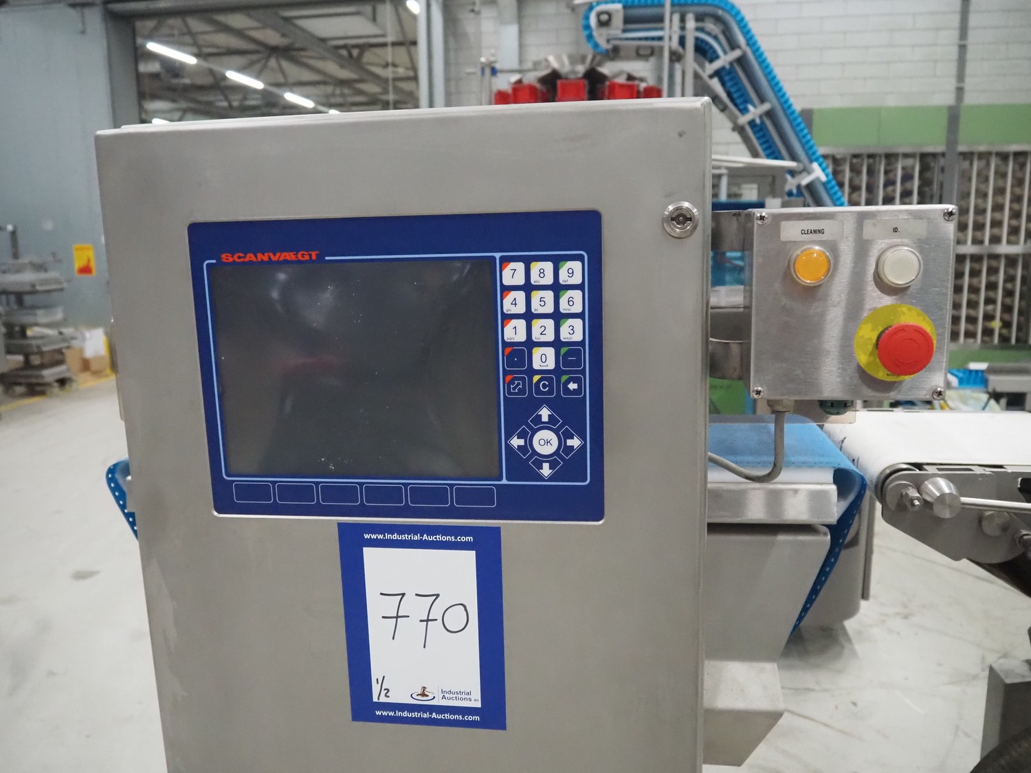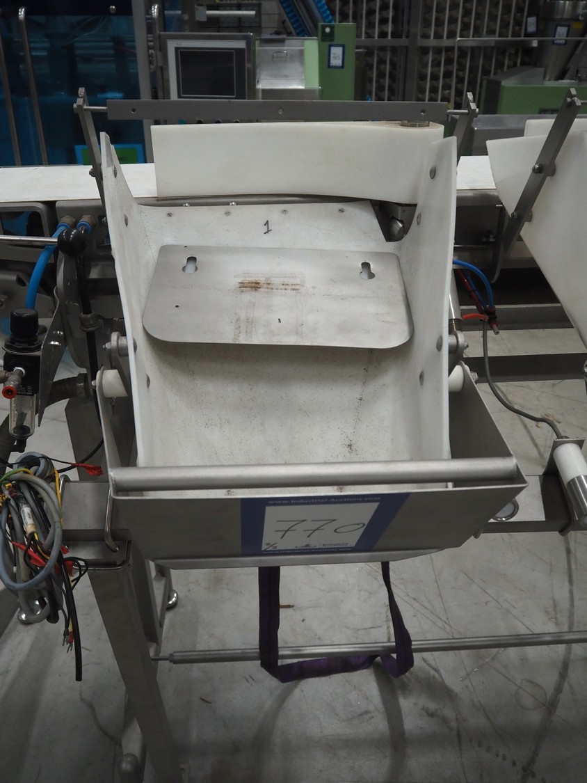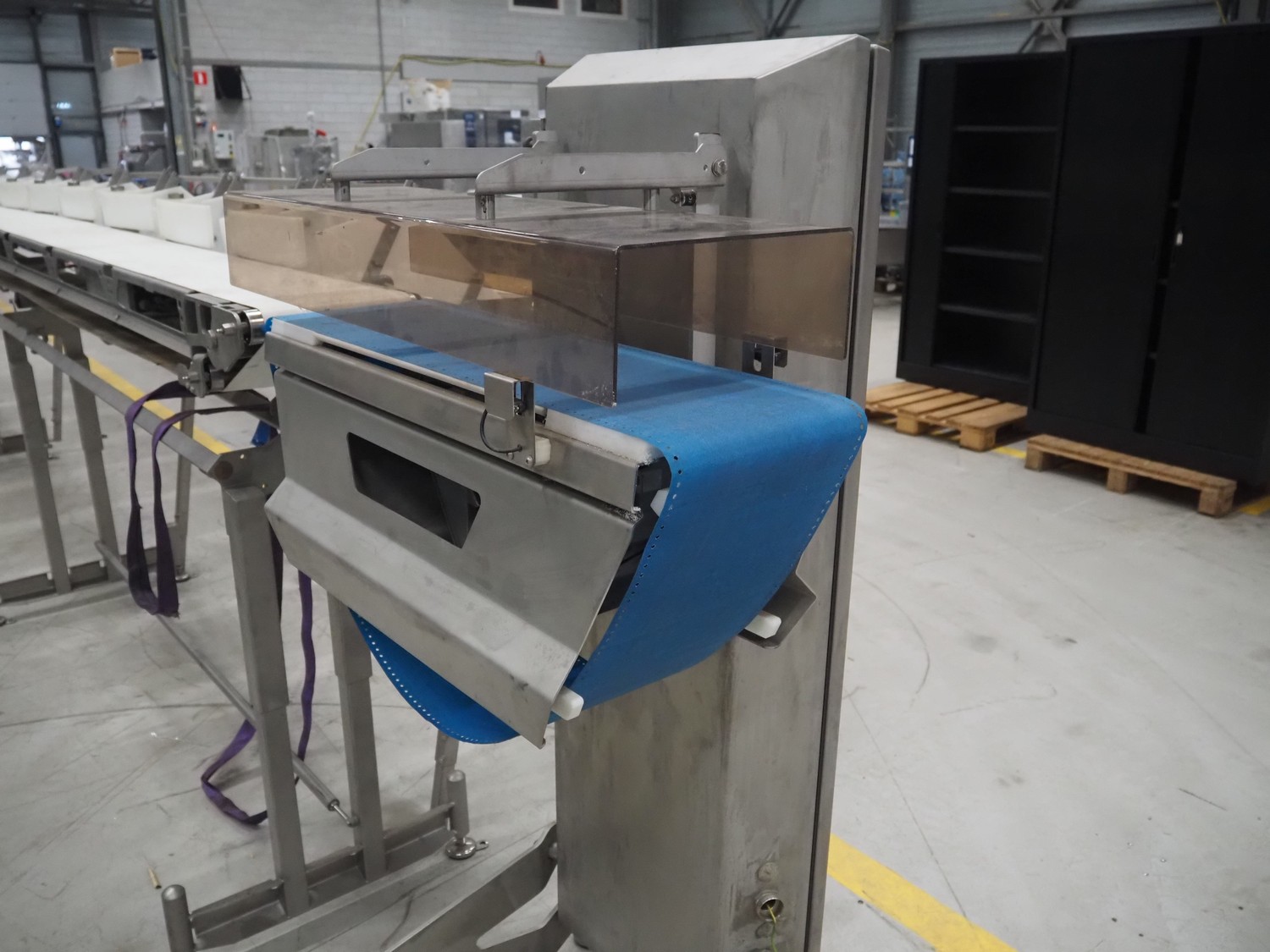 Scanvaegt weighing and sorting line, type: 4717.275.10, serial number: BOE00095, year of construction: 2006, 400 V, 3 Ph, 50/60 Hz, 16.0 A, s/s frame, plastic belts, belt width: 260 mm, 12 rejecters, total dimensions: 1000 mm x 800 mm x 1750 mm and 7200 mm x 1100 mm x 1600 mm.