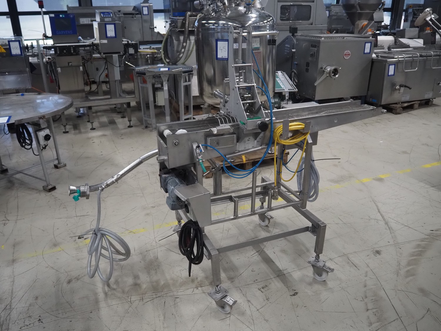 Koppens mobile coating machine, type: ER200, machine number: 1063, 415 V, 3 Ph, 50 Hz, 1.2 A, 0.27 kW, 67 kg, s/s mesh belt, belt width: 200 mm, total dimensions: 2200 mm x 860 mm x 1600 mm.