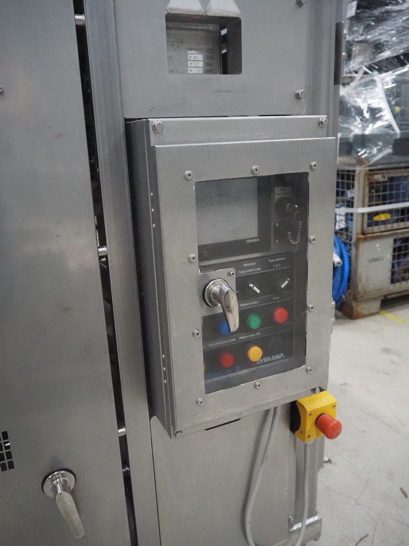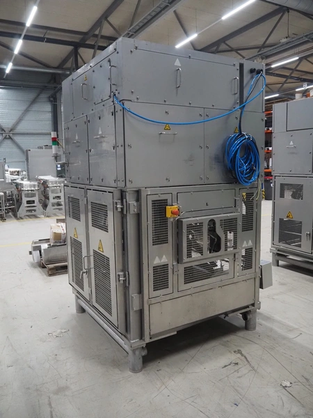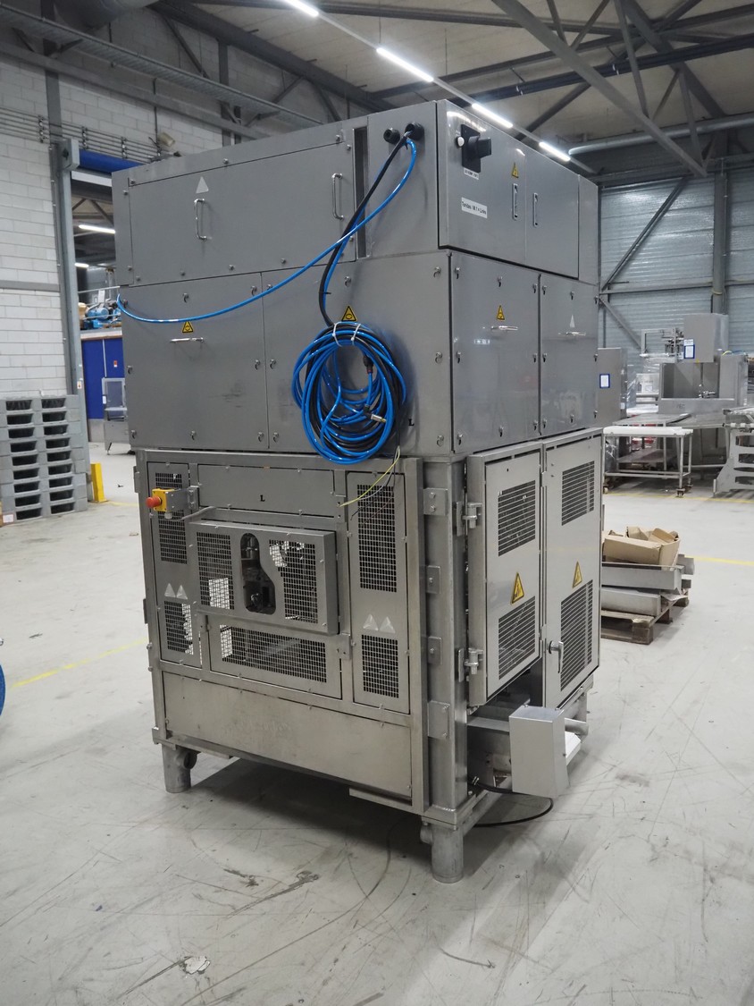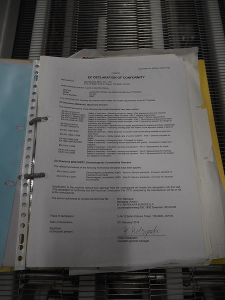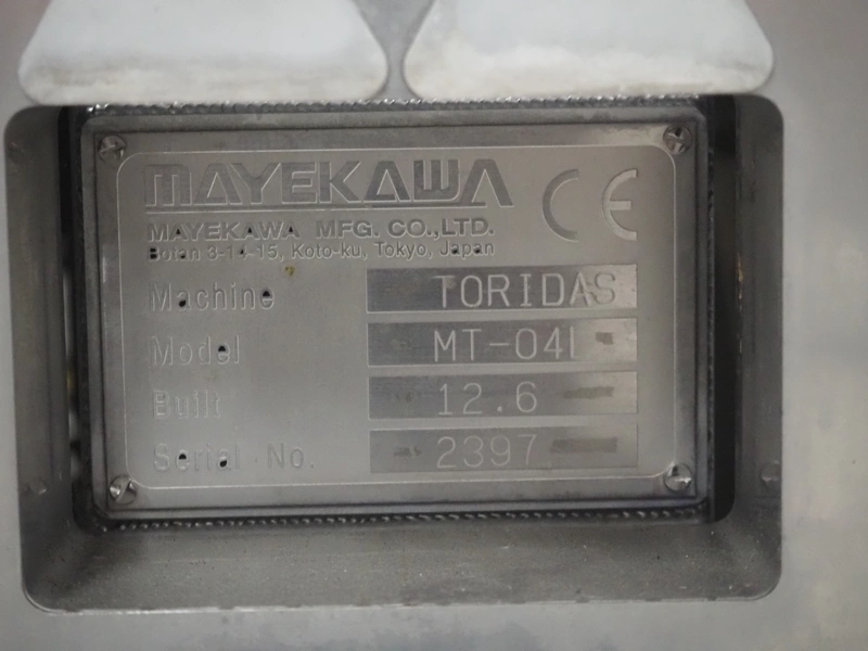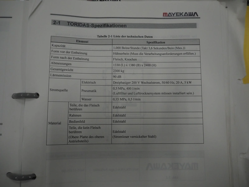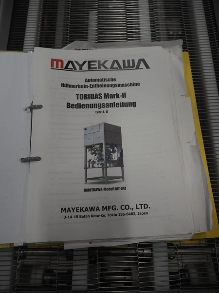 Mayekawa TORIDAS MARK II automatic chicken whole leg deboning machine, model: MT-04L, serial number: 2397, year of construction: 12.6, capacity: 1000 pieces per hour, plastic outfeed belt, belt width: 200 mm, total dimensions: 1600 mm x 1600 mm x 2350 mm. With 2 pallets with parts.