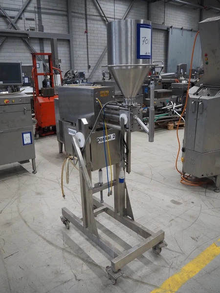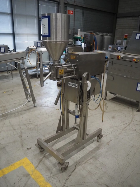 GEI Turbo mobile depositor, type: D100P, machine number: D100P4909500, year of construction: 1999, s/s hopper, hopper dimensions: Ø 280 mm x 470 mm, total dimensions: 1200 mm x 620 mm x 1820 mm.