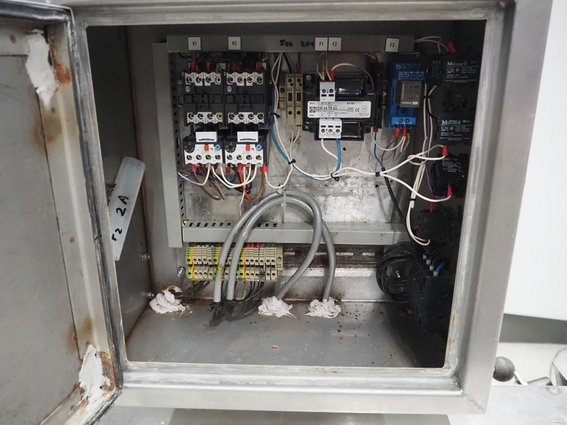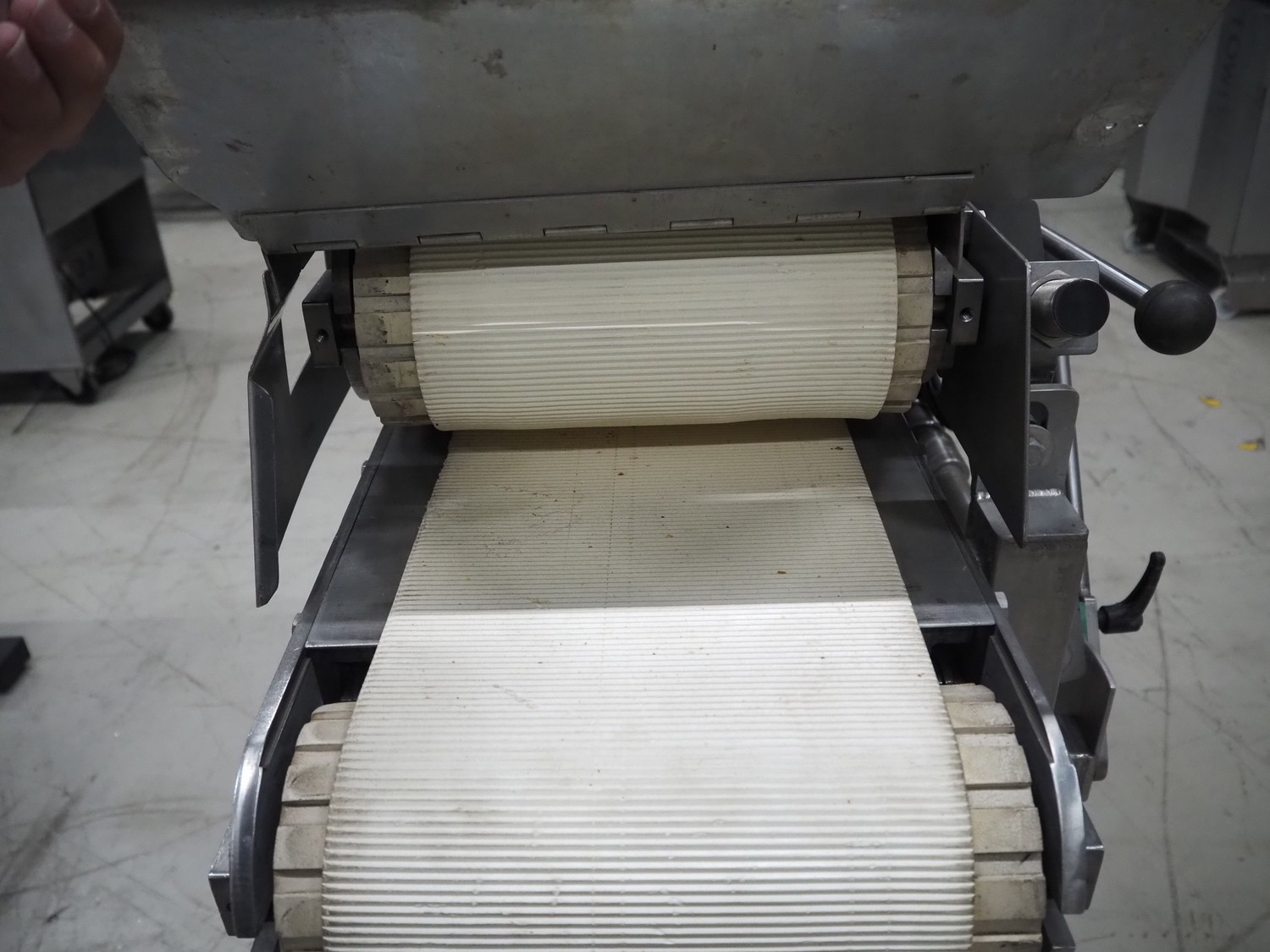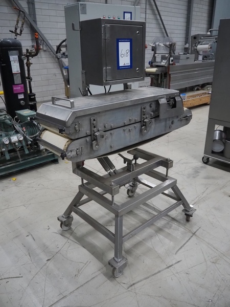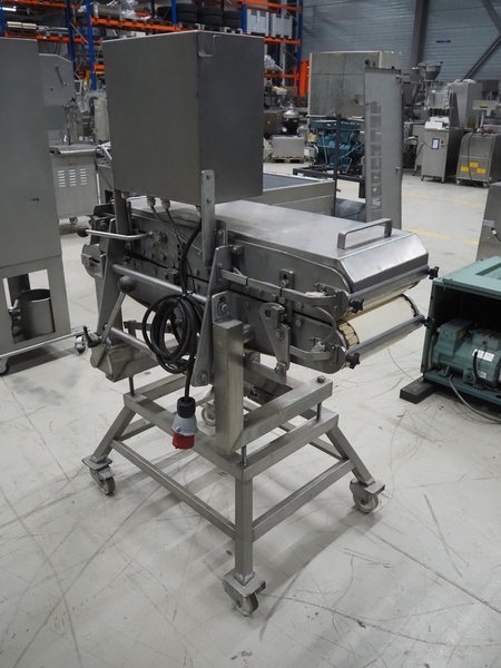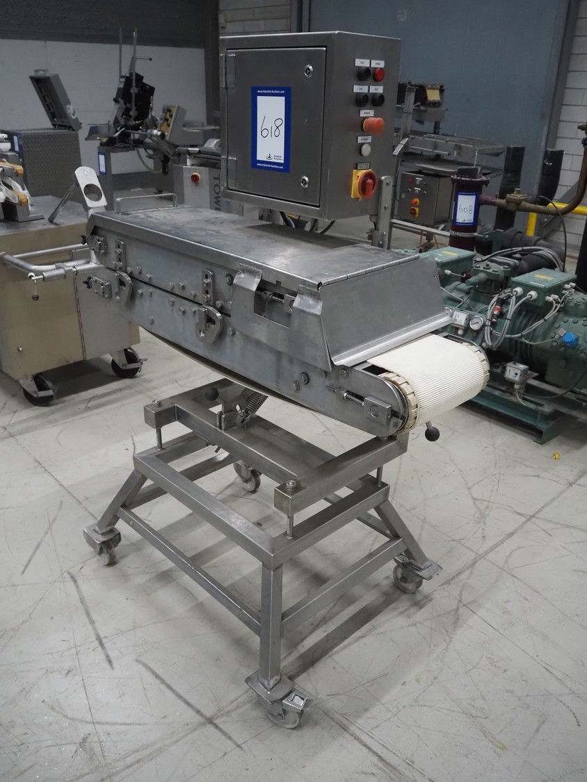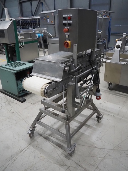Mobile flattener, plastic belts, belt width: 250 mm, total dimensions: 1300 mm x 750 mm x 1630 mm.