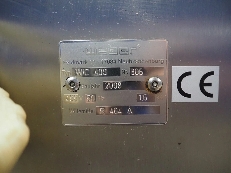 Weber ice machine with bunker, type: WIC 400, number: 306, year of construction: 2008, 400 V, 50 Hz, 1.6 A, refrigerant: R404a, capacity: 400 kg per 24 hours, L'Unite Hermetique cooling compressor, dimensions: 1200 mm x 800 mm x 2000 mm.