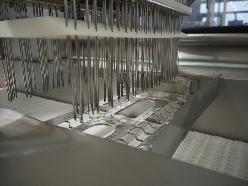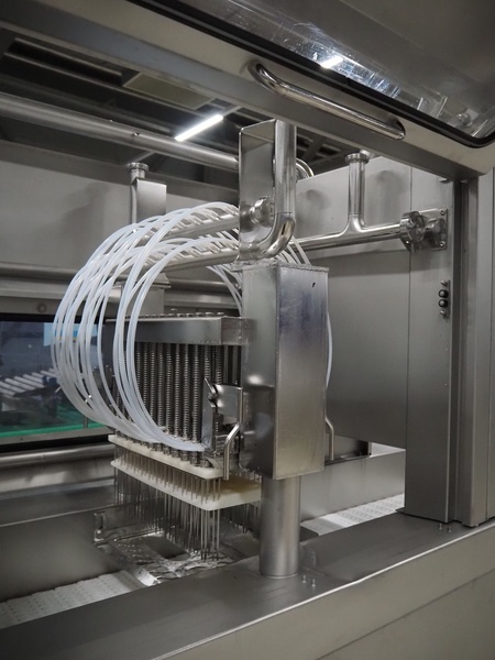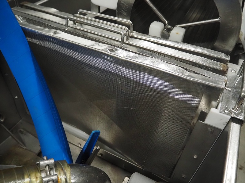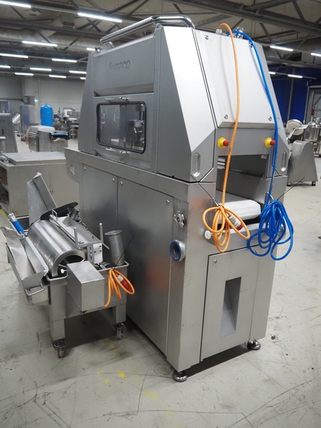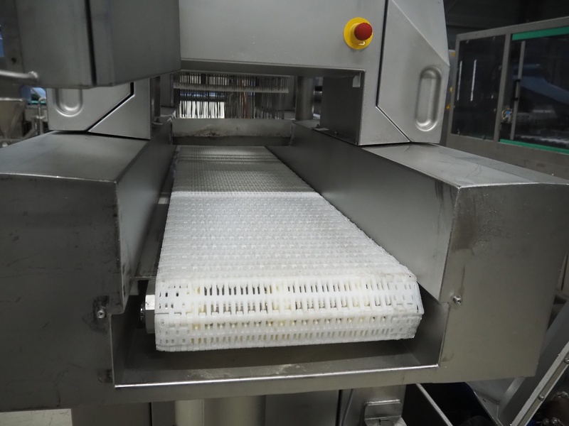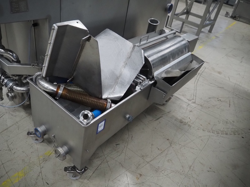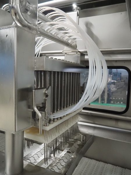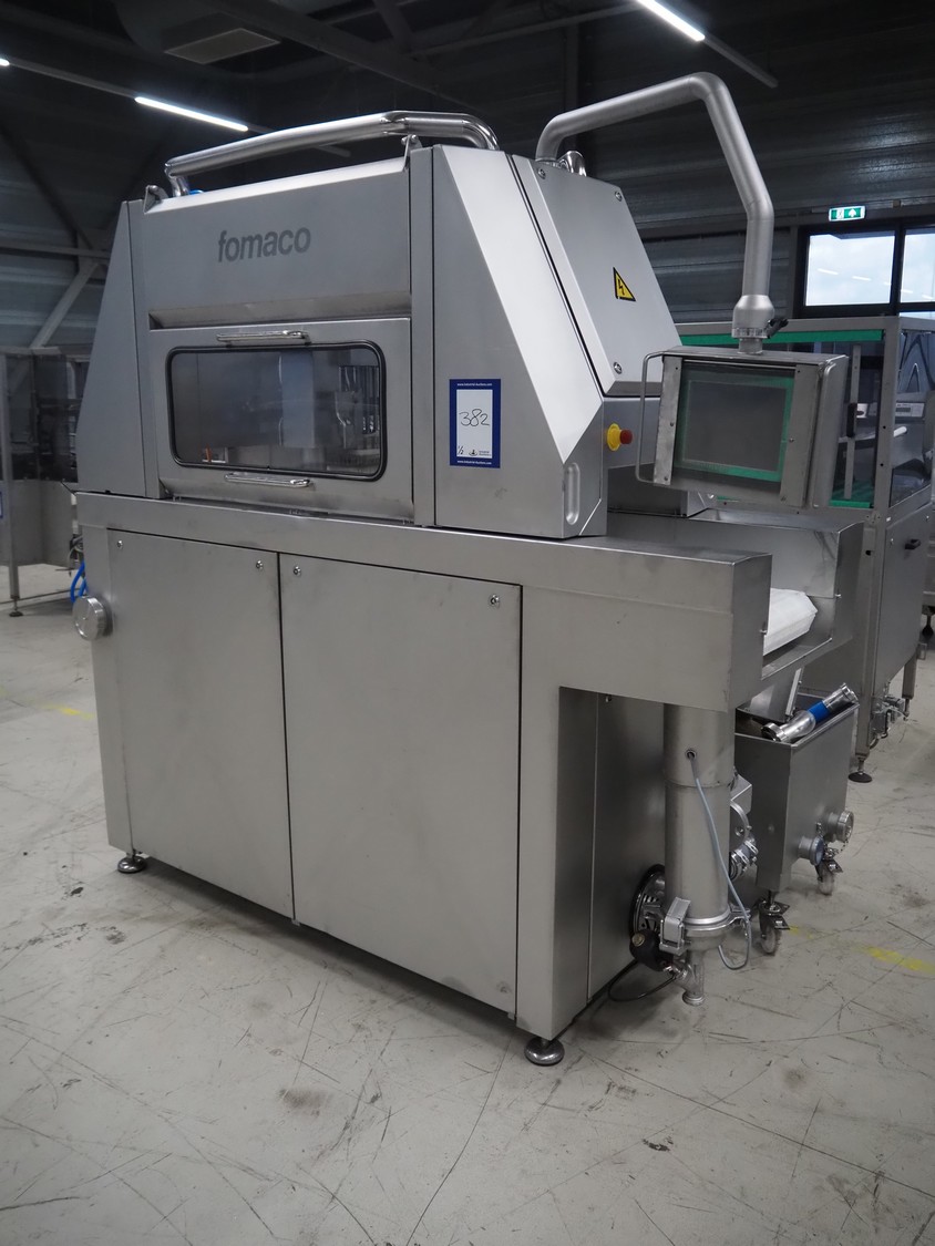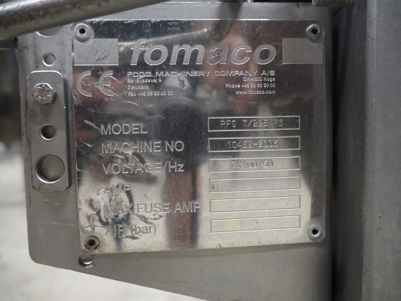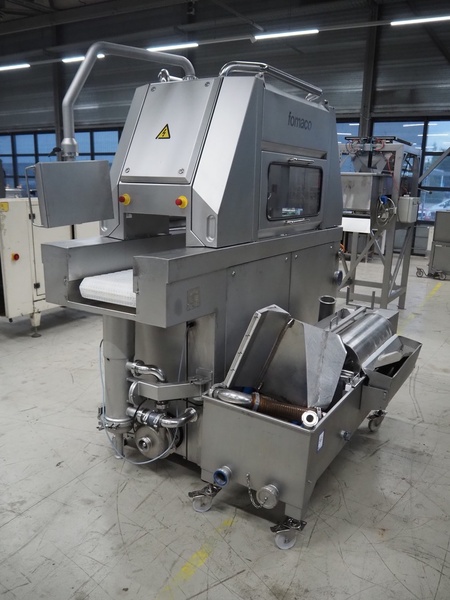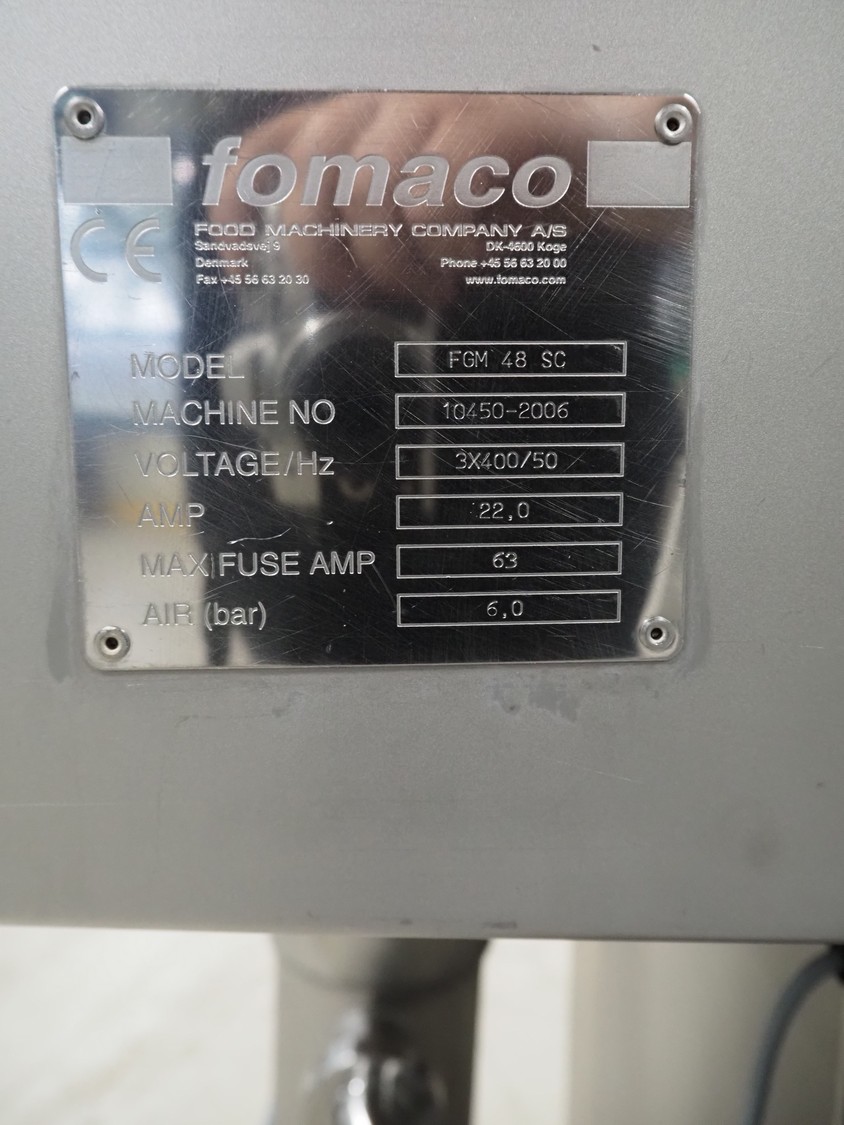 Fomaco Food Machinery Company A/S injector with filter tub, model: FGM 48 SC, machine number: 10450-2006, 400 V, 3 Ph, 50 Hz, 22/63 A, 6 bar, 192 needles, plastic mesh belt, belt width: 390 mm, total dimensions: 2400 mm x 950 mm x 2300 mm, dimensions filter tub: 2000 mm x 750 mm x 900 mm.