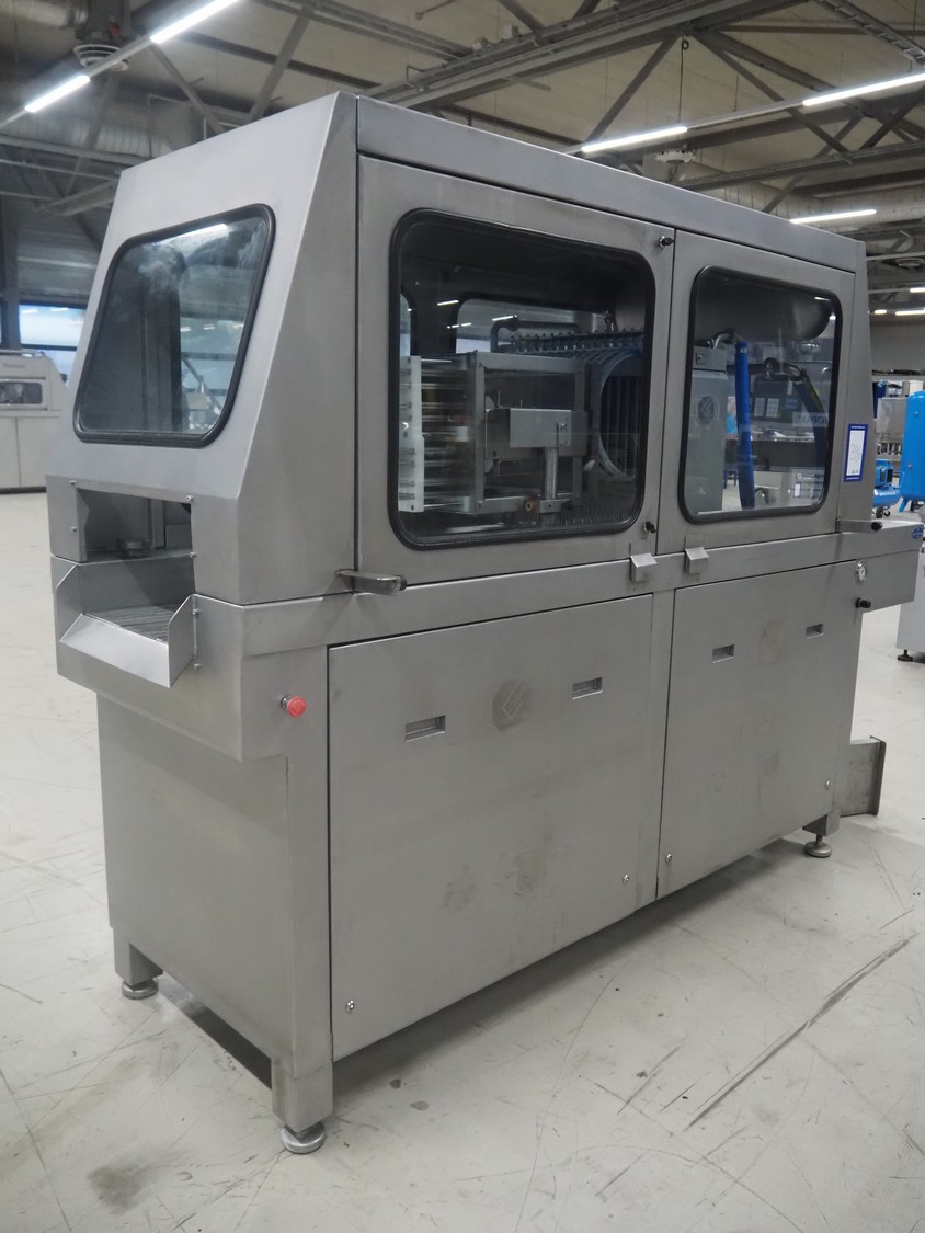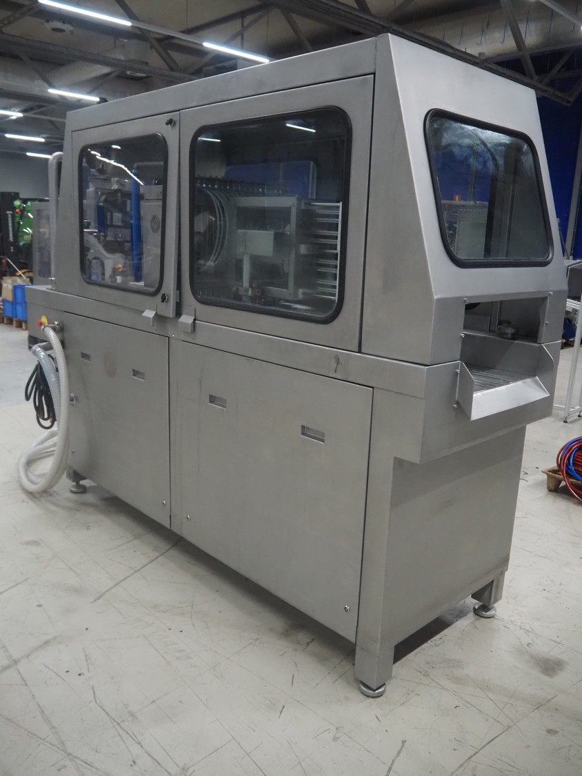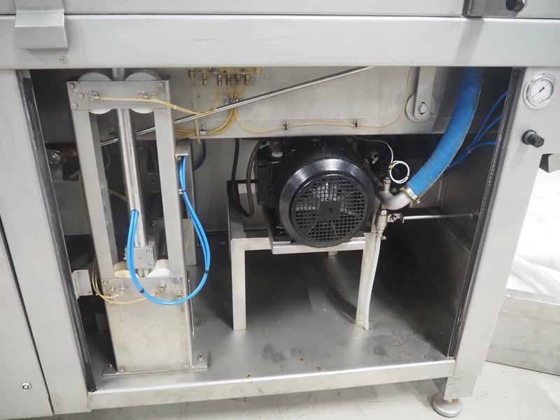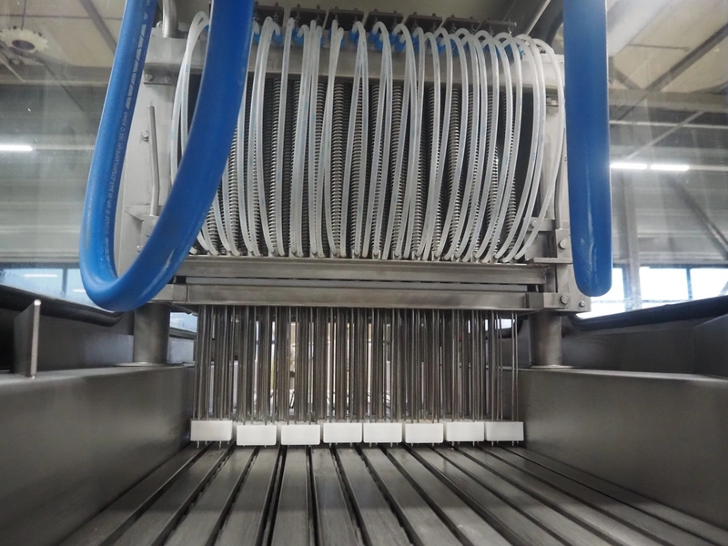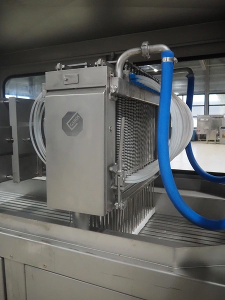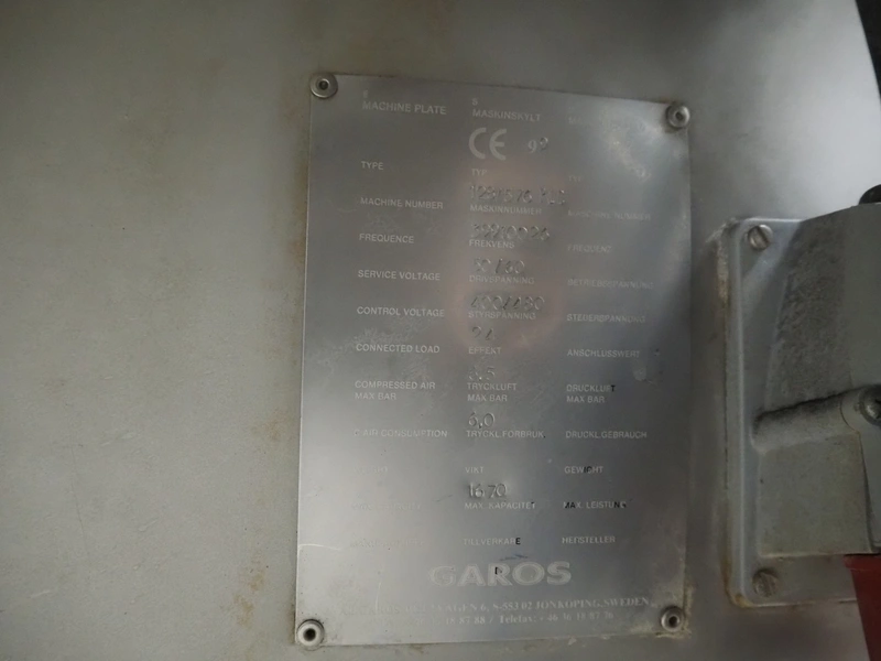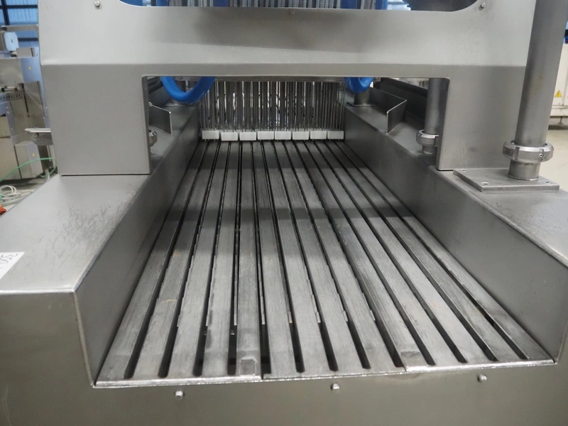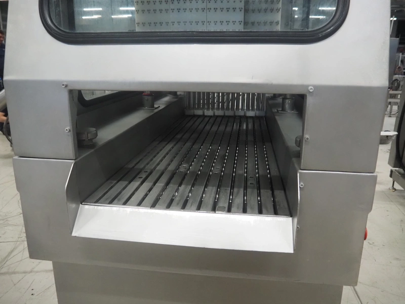 Garos injector and tenderizer, type: 128/576 PLC, machine number: 39910026, 400/480 V, 50/60 Hz, 6 bar, 1670 kg, 128 needles, clearance: 550 mm x 310 mm, s/s walking beam, beam width: 550 mm, total dimensions: 3200 mm x 920 mm x 2170 mm.
