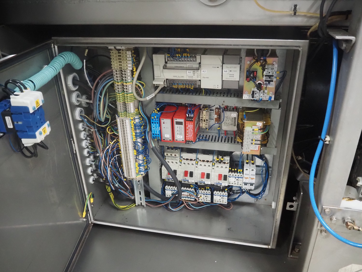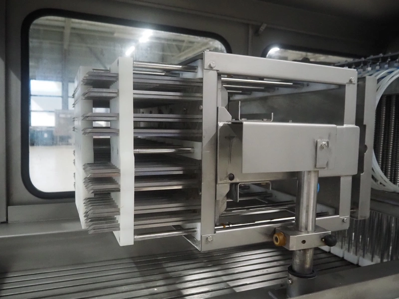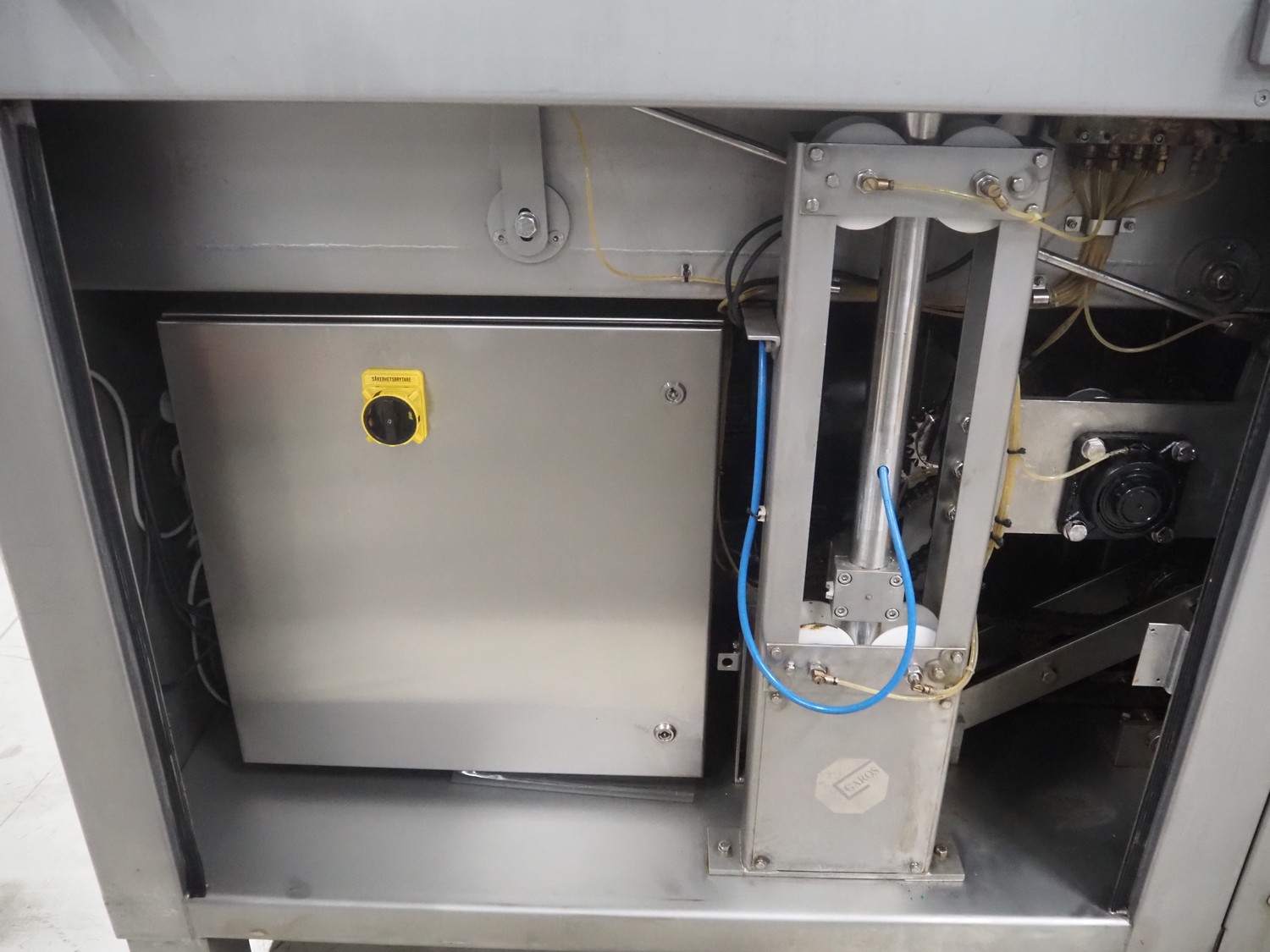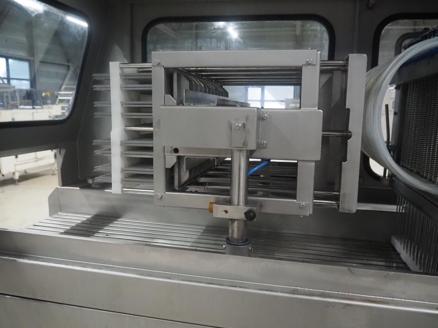 Garos injector and tenderizer, type: 128/576 PLC, machine number: 39910026, 400/480 V, 50/60 Hz, 6 bar, 1670 kg, 128 needles, clearance: 550 mm x 310 mm, s/s walking beam, beam width: 550 mm, total dimensions: 3200 mm x 920 mm x 2170 mm.