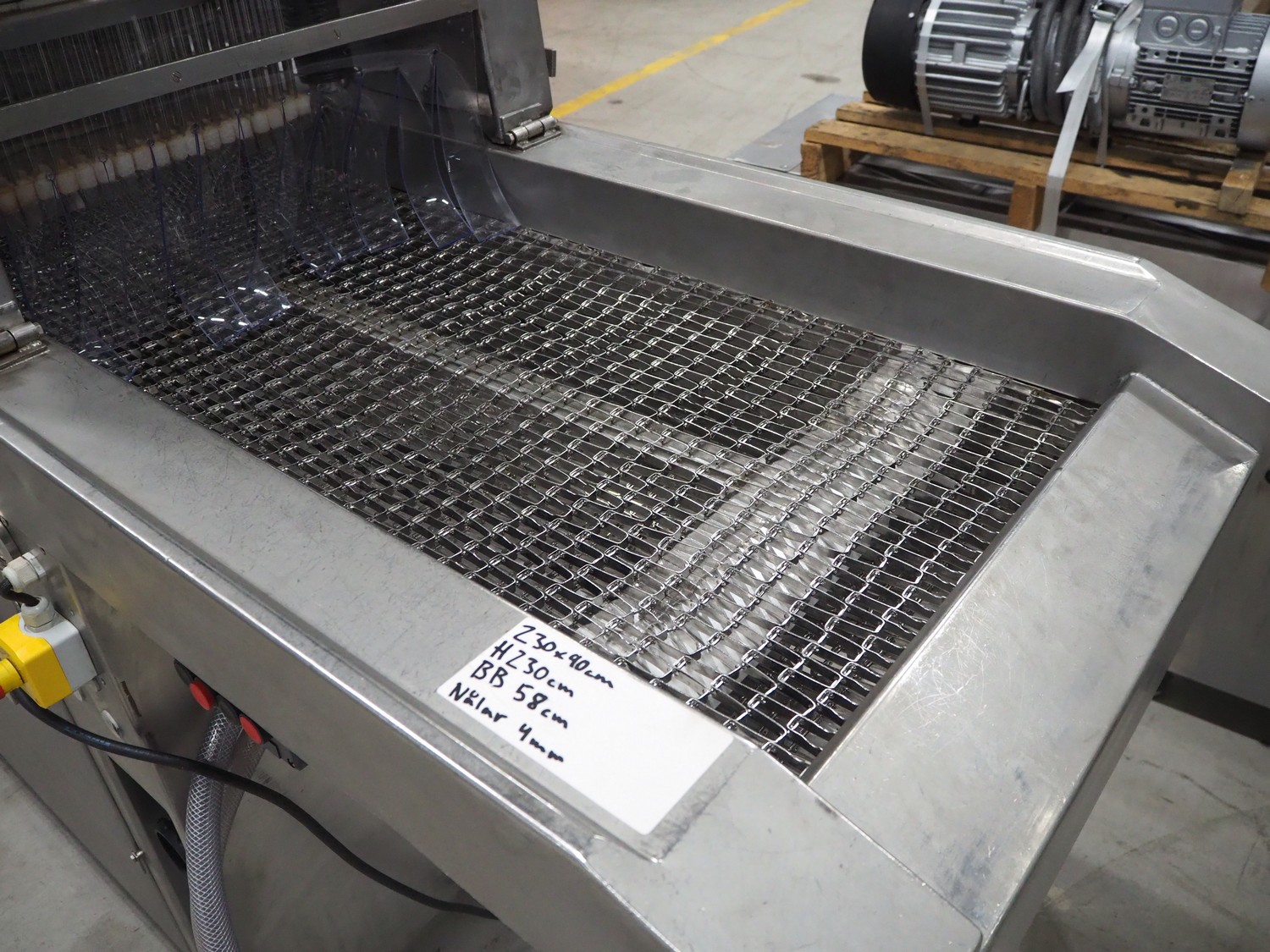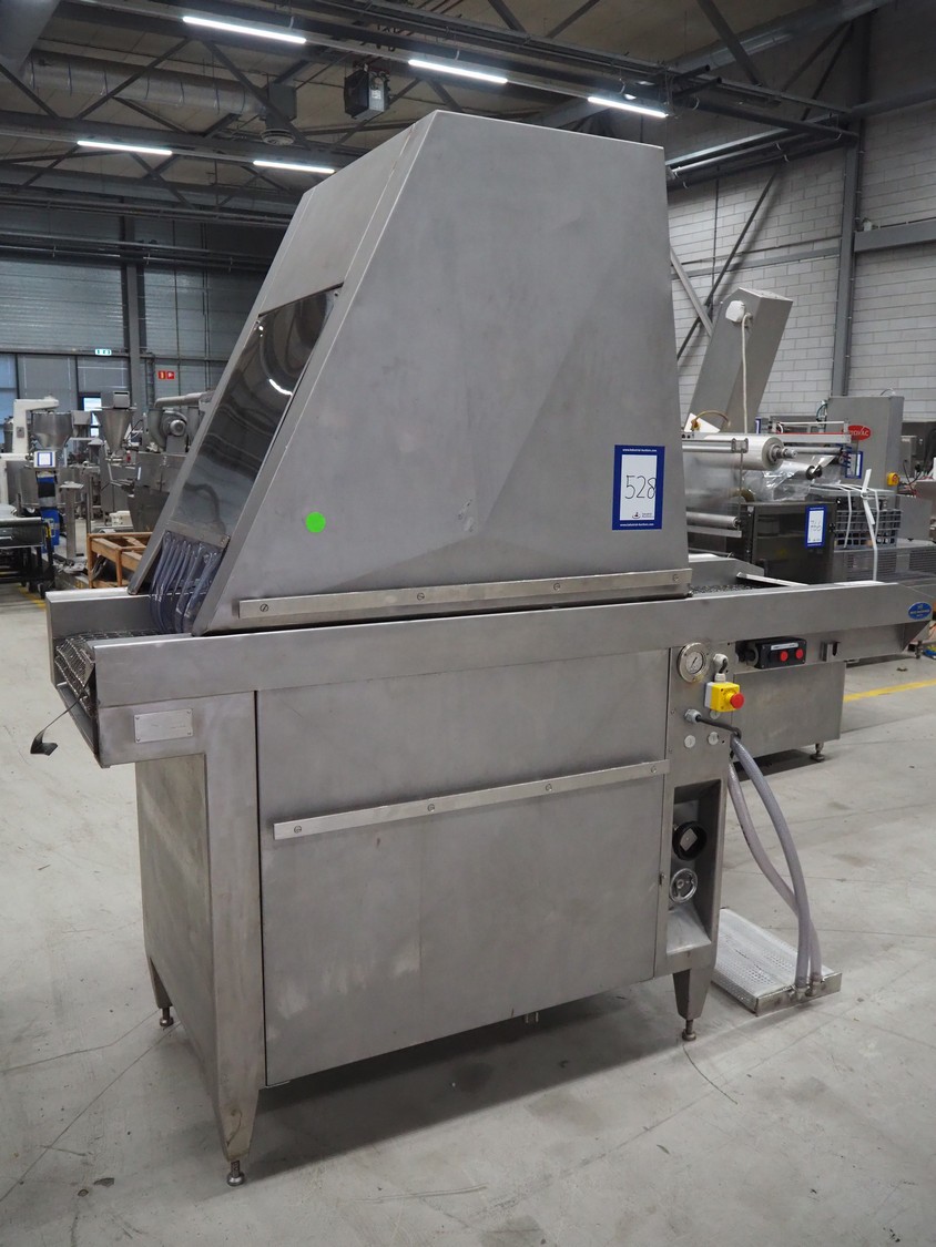 Fomaco Food Machinery Company A/S injector, machine number: 1189 1979, 44 needles, s/s mesh belt, belt width: 580 mm, total dimensions: 2300 mm x 900 mm x 2300 mm.