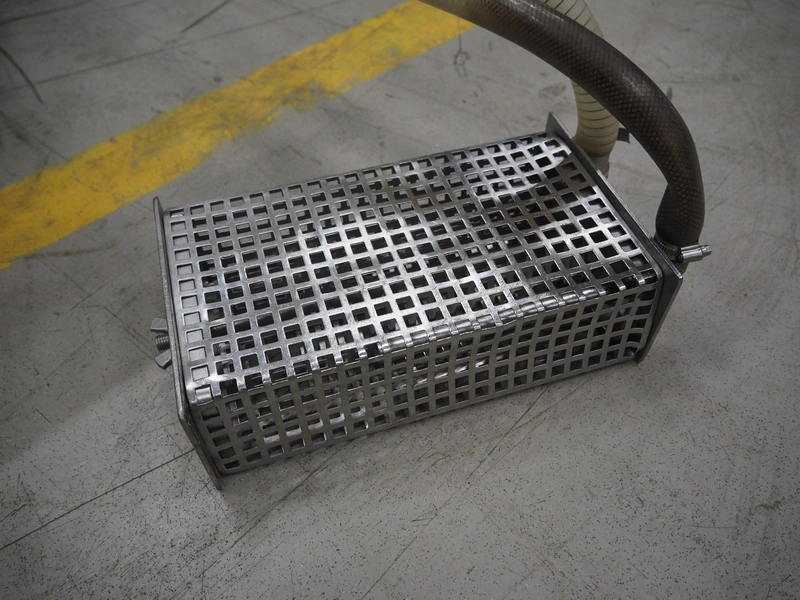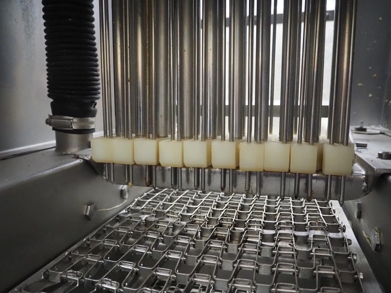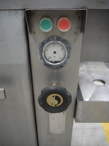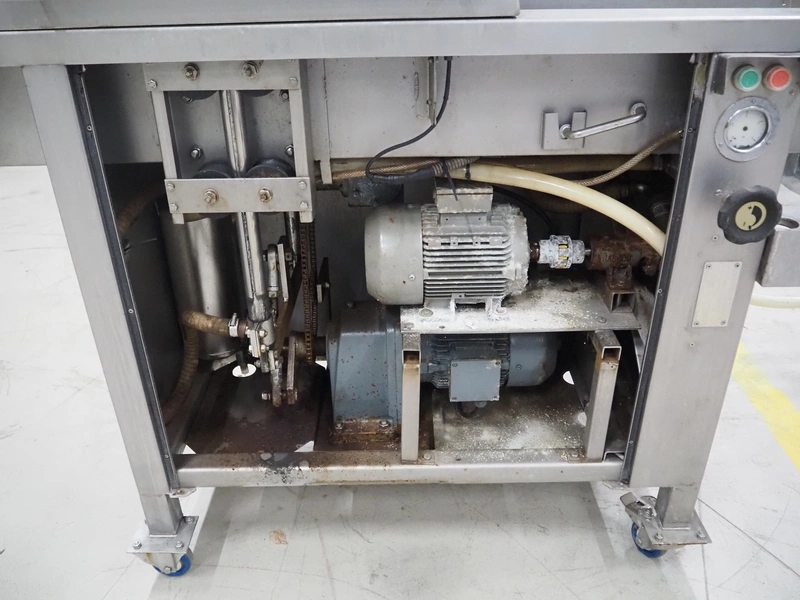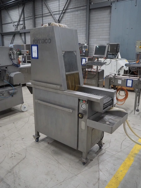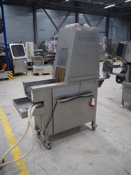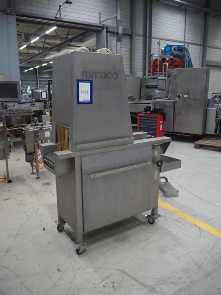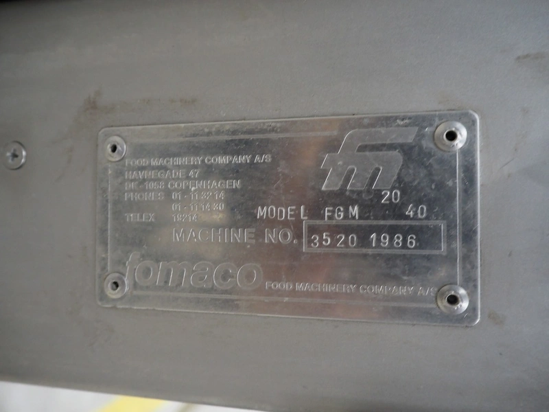 Fomaco Food Machinery Company A/S mobile injector, model: FGM 20 40, machine number: 3520 1986, s/s mesh belt, belt width: 235 mm, clearance: 280 mm x 240 mm, total dimensions: 1450 mm x 580 mm x 1880 mm.