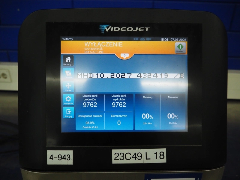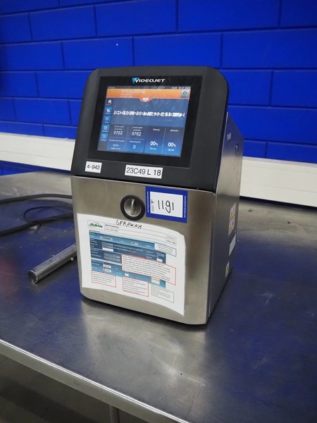 Videojet inkjet printer, model: 1860, serial number: 19163023C49ZH, 100-120/200-240 V, 1 Ph, 50/60 Hz, 2 A, 70 W, toner: V7206L, make-up: V901Q- 1l, ink: V4211-L, dimensions: 370 mm x 400 mm x 610 mm.