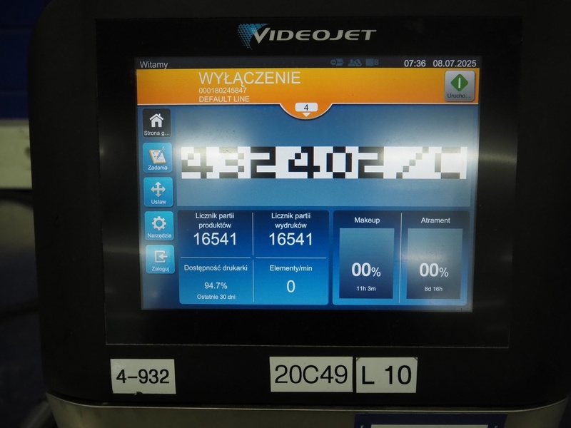 Videojet inkjet printer, model: 1860, serial number: 19163020C49ZH, 100-120/200-240 V, 1 Ph, 50/60 Hz, 2 A, 70 W, toner: V7206L, make-up: V901Q- 1l, ink: V4211-L, dimensions: 370 mm x 400 mm x 610 mm.