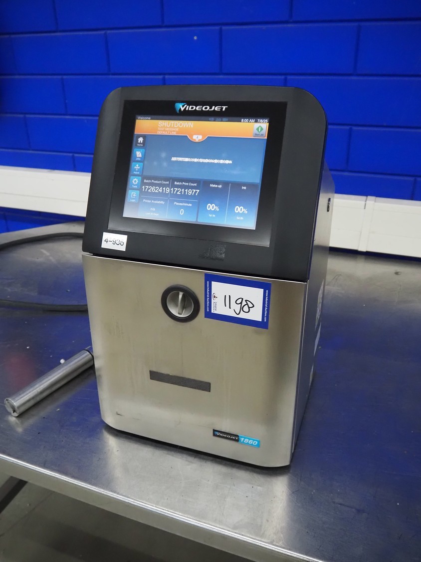 Videojet inkjet printer, model: 1860, serial number: 19163024C49ZH, 100-120/200-240 V, 1 Ph, 50/60 Hz, 2 A, 70 W, toner: V7206L, make-up: V901Q- 1l, ink: V4211-L, dimensions: 370 mm x 400 mm x 610 mm.