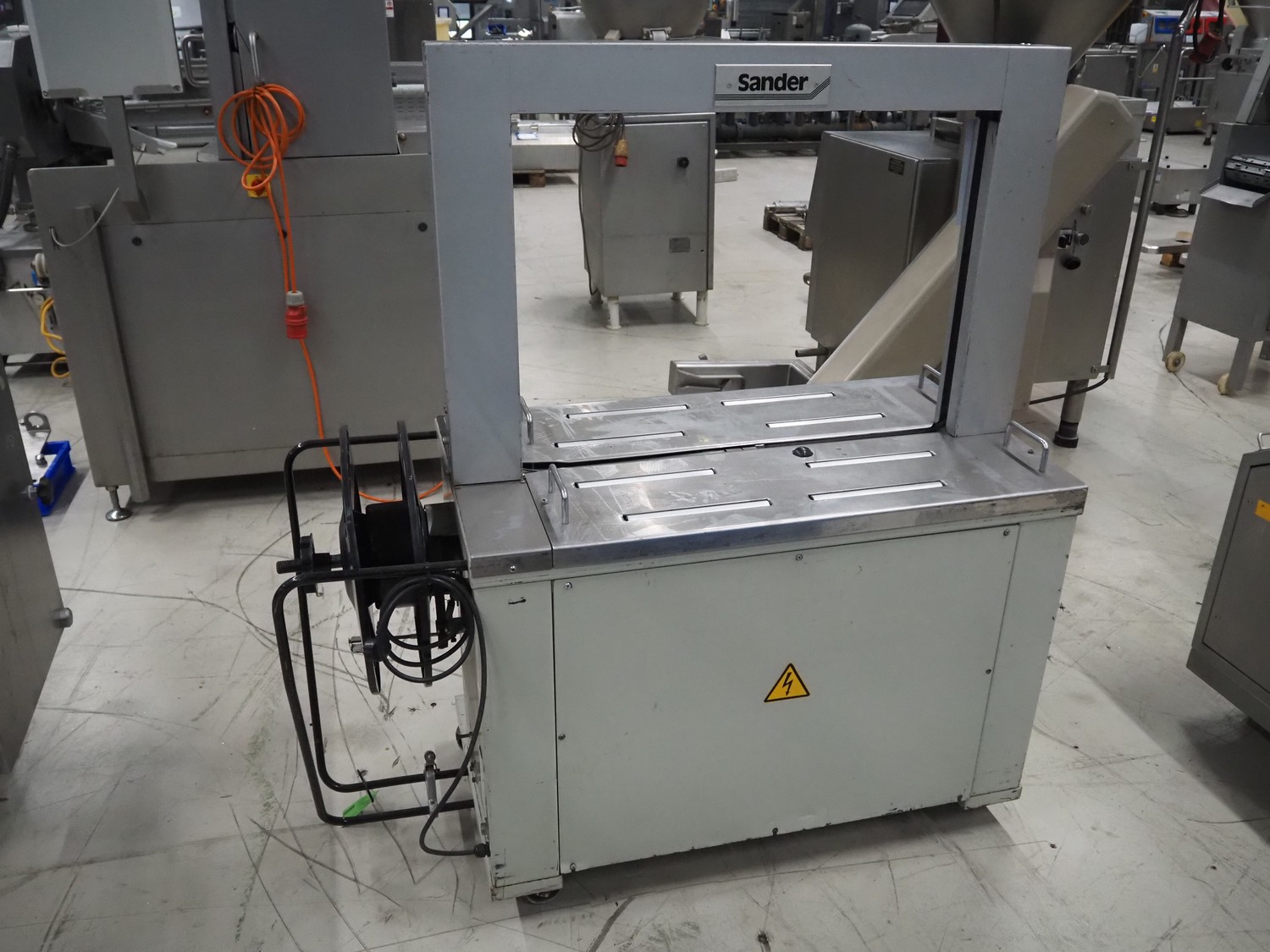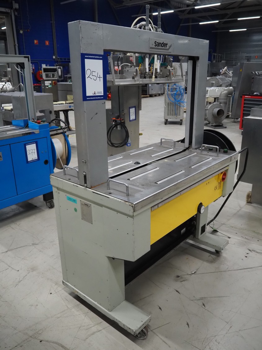Sander mobile strapping machine, model: TZ/3, number: 0075722, year of construction: 2002, 230 V, 1 Ph, 50 Hz, 1.0 kW, clearance: 850 mm x 600 mm, total dimensions: 1420 mm x 630 mm x 1570 mm.