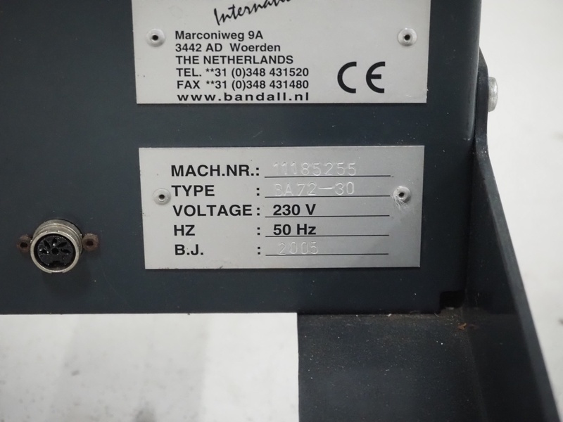 Bandall mobile binding machine, type: BA72-30, machine number: 11185255, year of construction: 2005, 230 V, 50 Hz, clearance: 680 mm x 360 mm, dimensions: 1300 mm x 520 mm x 1450 mm.
