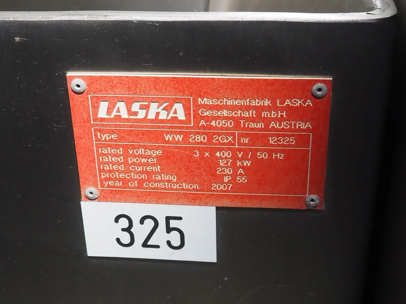Laska Maschinenfabrik grinder, type: WW 280 2 GX, number: 12325, year of construction: 2007, 400 V, 3 Ph, 50 Hz, 230 A, 127 kW, weight: 2700 kg, plate diameter: 280 mm, total dimensions: 2400 mm x 1910 mm x 2200 mm.