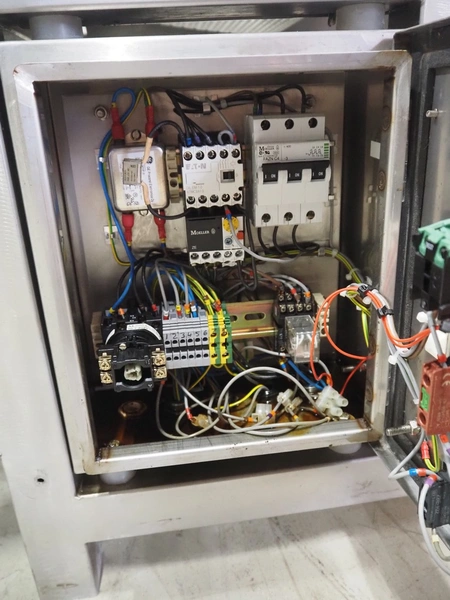 Cintex LTD metal detector with 2 metal detector heads and rejecting belt, type: KHRB30, serial number: 79959, year of construction: 1998, 400 V, 3 Ph, 50 Hz, 3 A, plastic mesh belt, belt width: 300 mm, total dimensions: 2720 mm x 880 mm x 1100 mm. Damaged.
