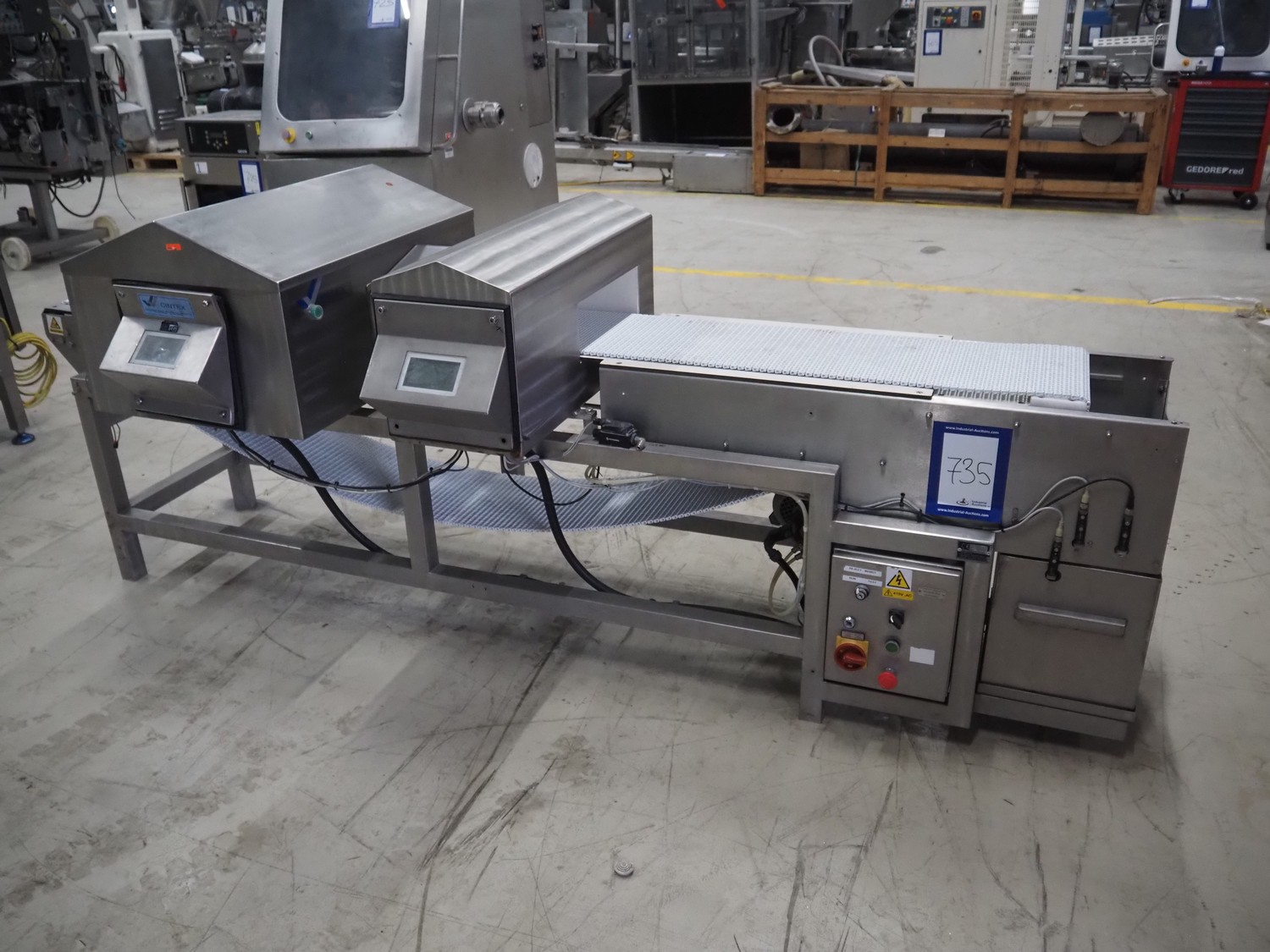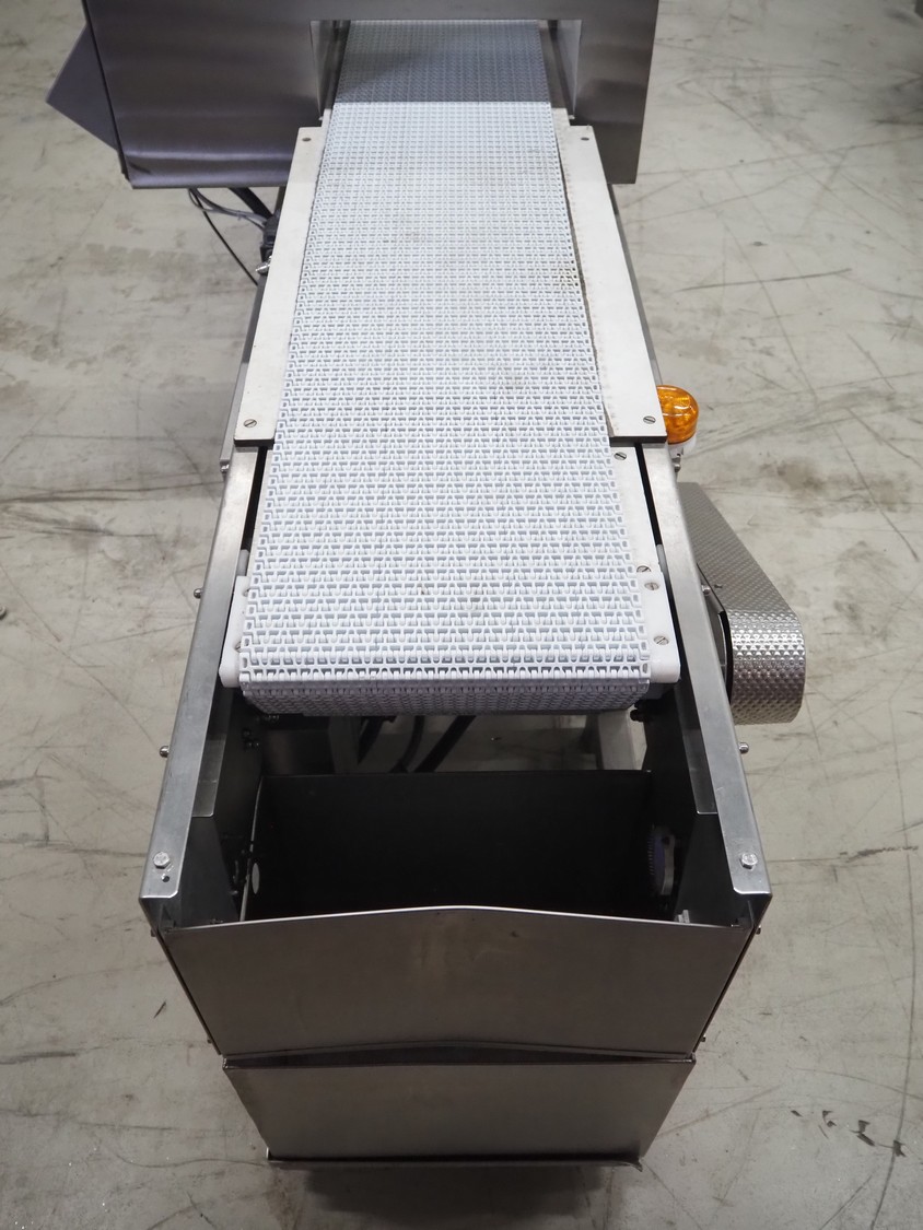 Cintex LTD metal detector with 2 metal detector heads and rejecting belt, type: KHRB30, serial number: 79959, year of construction: 1998, 400 V, 3 Ph, 50 Hz, 3 A, plastic mesh belt, belt width: 300 mm, total dimensions: 2720 mm x 880 mm x 1100 mm. Damaged.