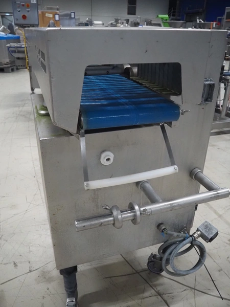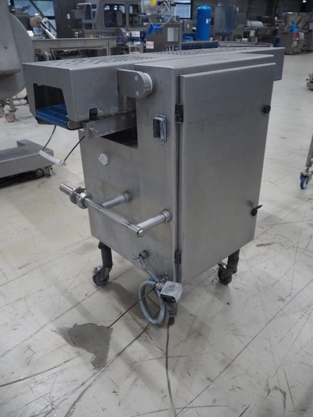 Handtmann mobile portioning machine, type: 99-2, number: 24844, year of construction: 2008, plastic belts, belt width: 250 mm, working width: 280 mm, total dimensions: 1420 mm x 650 mm x 1270 mm.