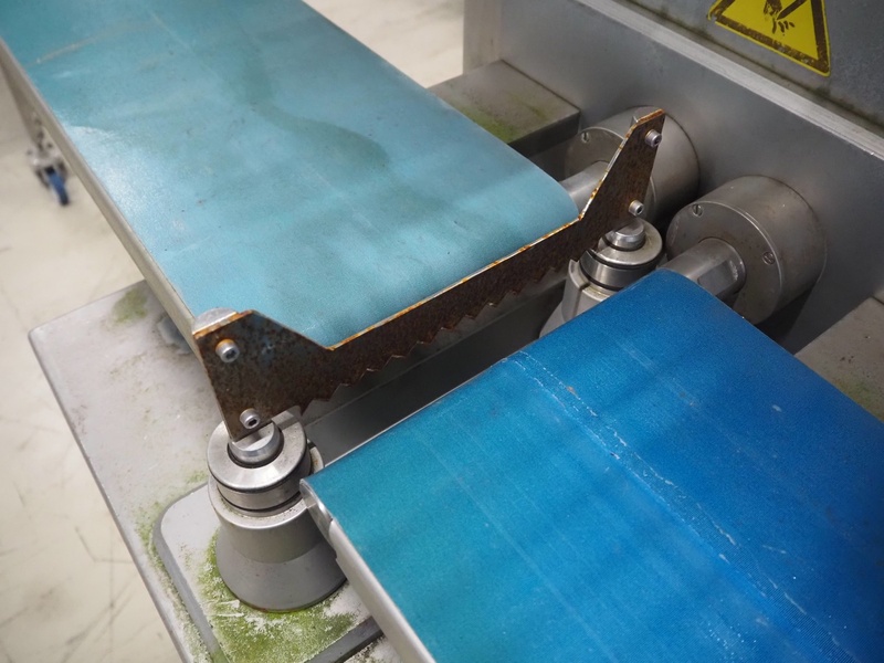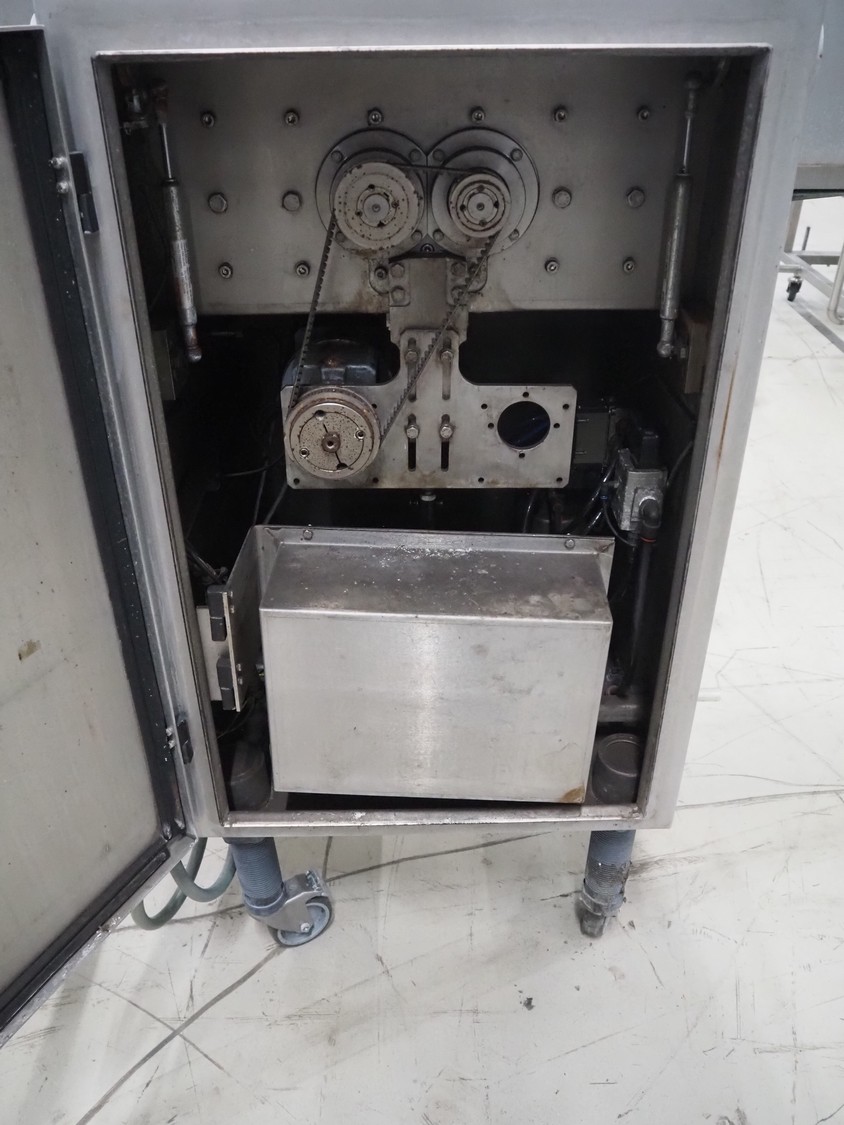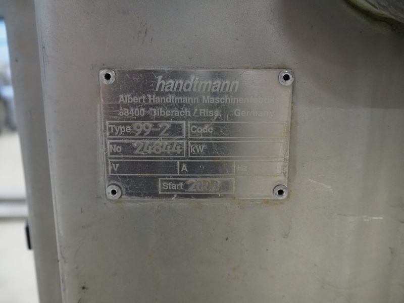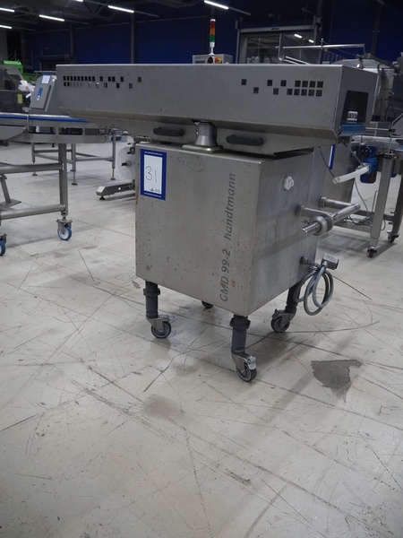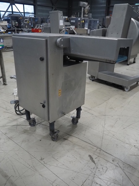 Handtmann mobile portioning machine, type: 99-2, number: 24844, year of construction: 2008, plastic belts, belt width: 250 mm, working width: 280 mm, total dimensions: 1420 mm x 650 mm x 1270 mm.