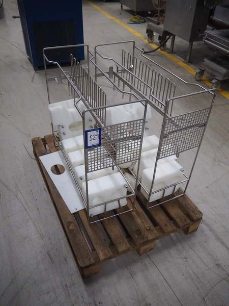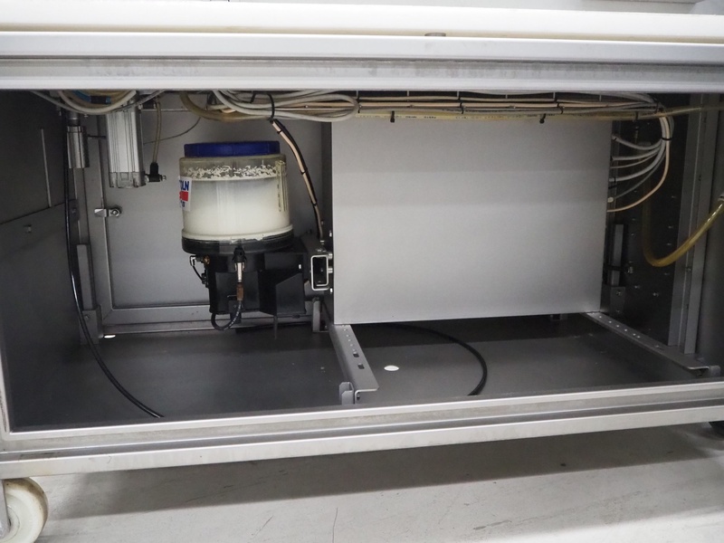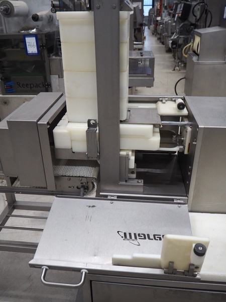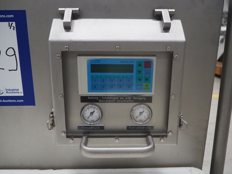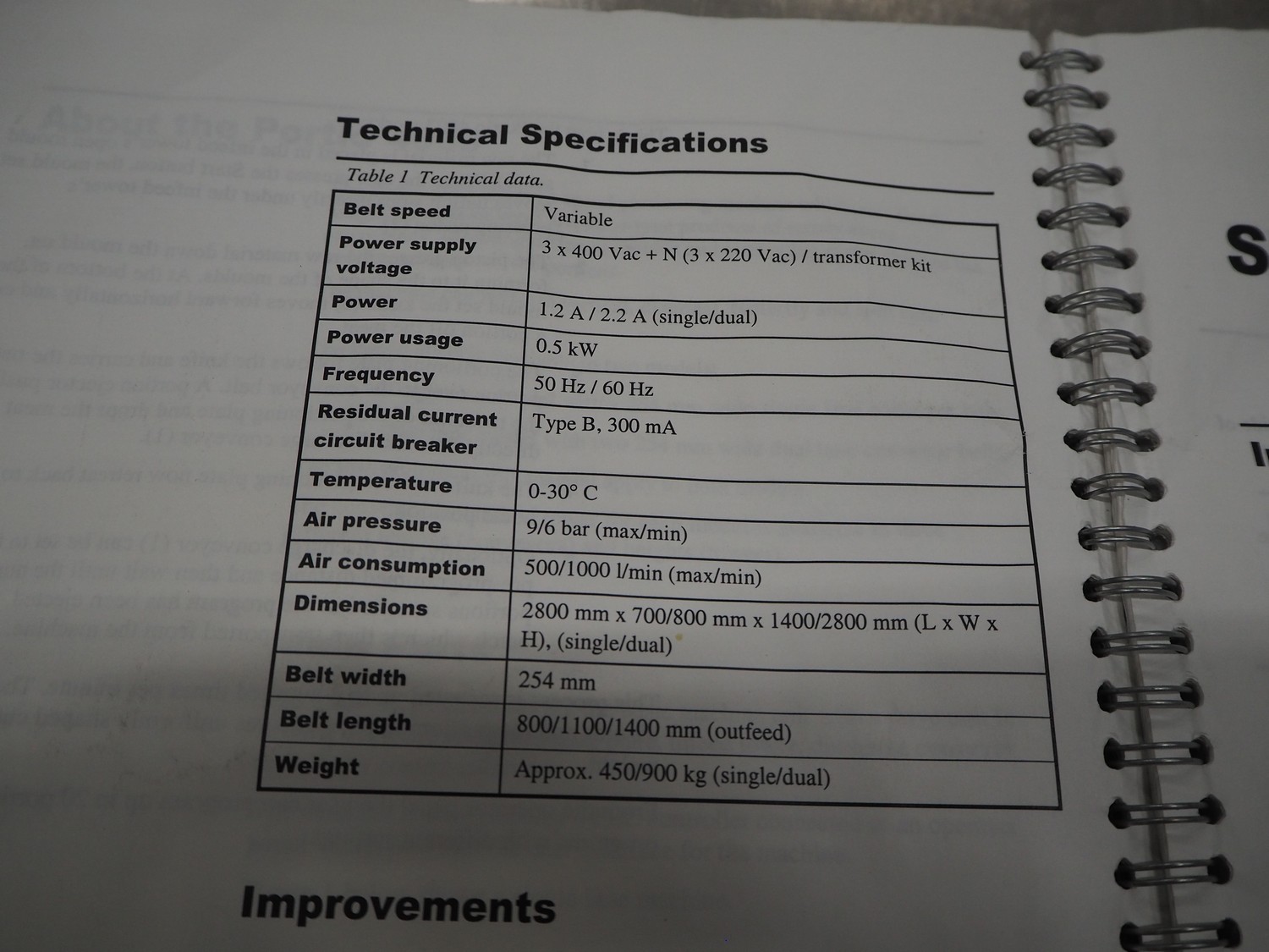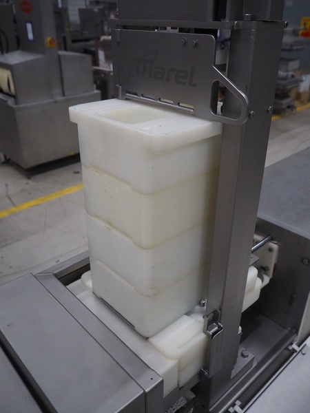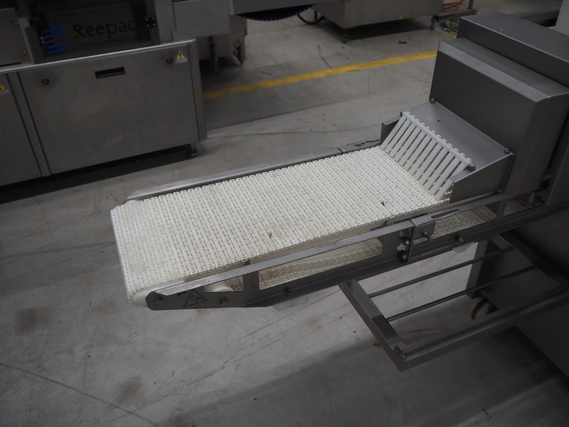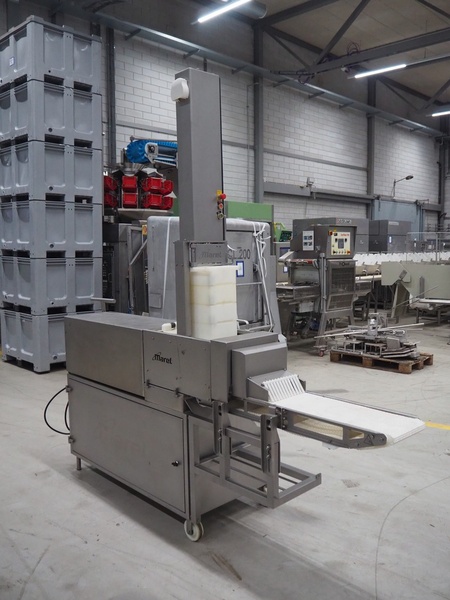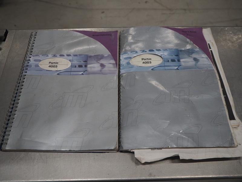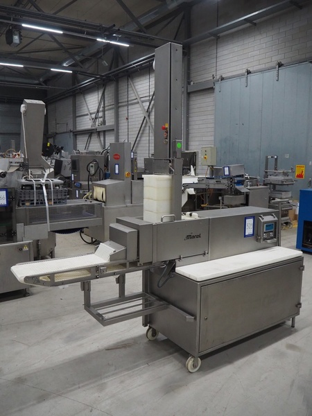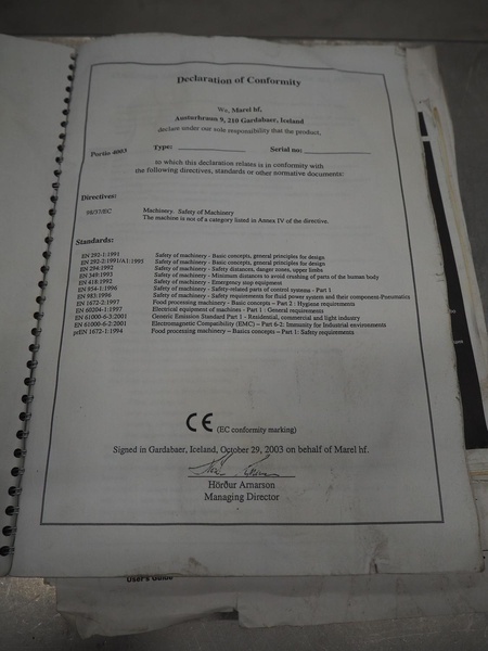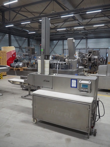 Marel mobile portioning machine, type: Portio 4003 S, serial number: 080S-0020, year of construction: 2004, 400/220 V, 3 Ph, 50/60 Hz, 1.2/2.2 A, 0.5 kW, weight: 500 kg, pressure: 6 / 9 bar, dye: (2x) 90 mm x 90 mm, plastic mesh outfeed belt, belt width: 250 mm, total dimensions: 2600 mm x 740 mm x 2550 mm. Including pallet with parts.