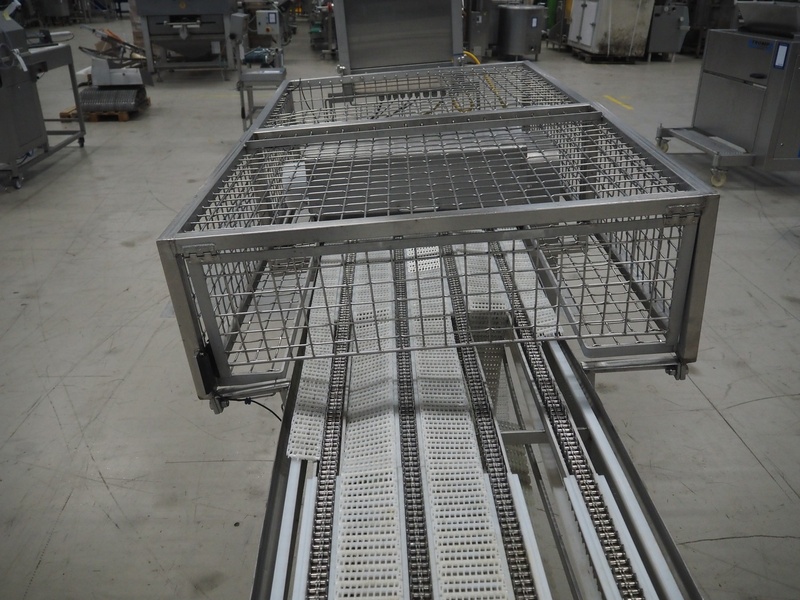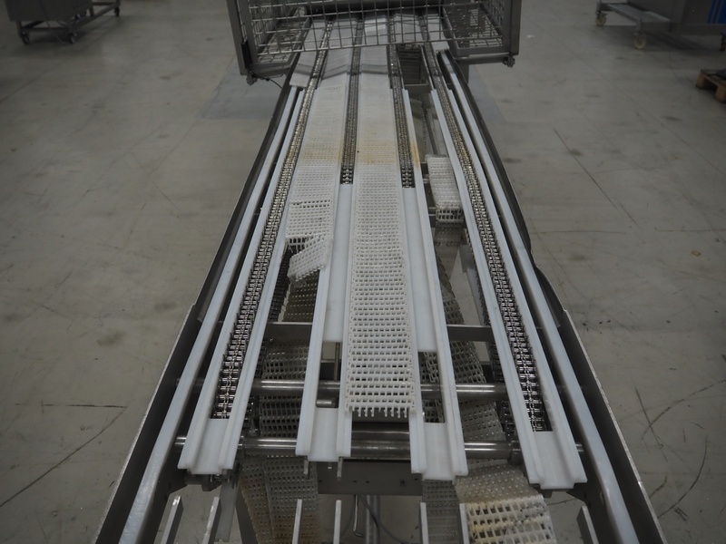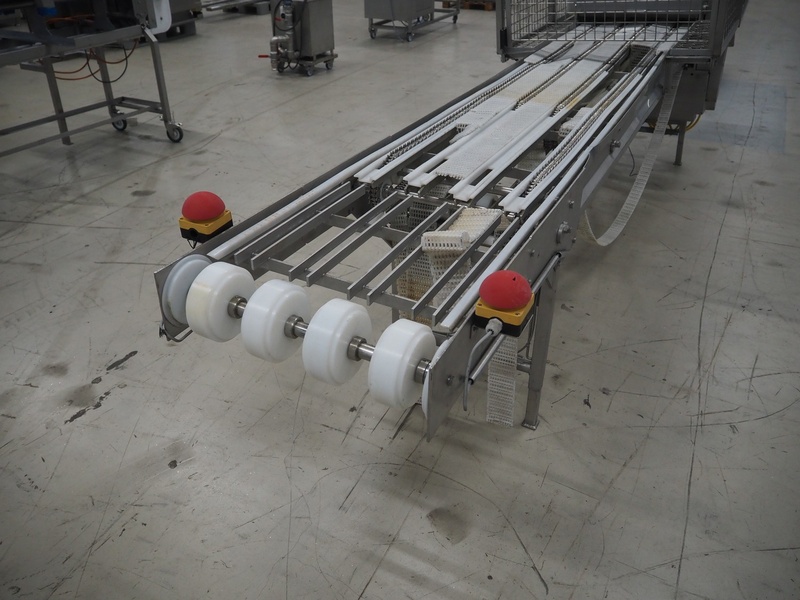 Marvu slicer, type: 322, year of construction: 02-2001, 4 knives ,diameter knives: 170 mm, plastic mesh belt, belt width: (3x) 90 mm and (2x) 60 mm, total dimensions: 4500 mm x 1000 mm x 1700 mm.