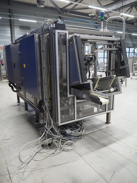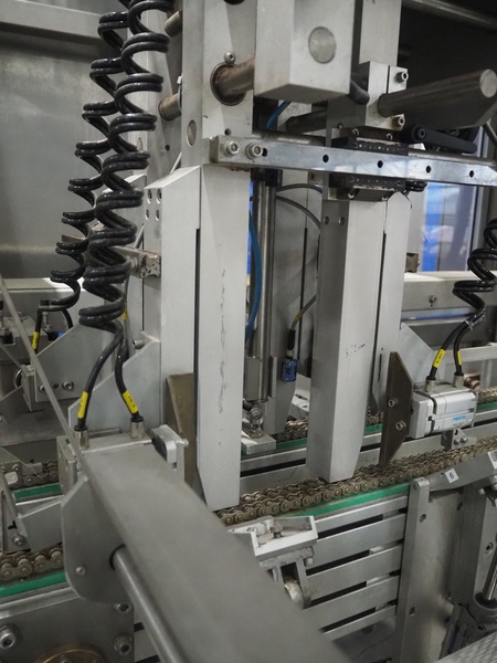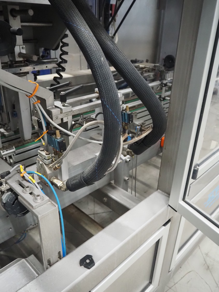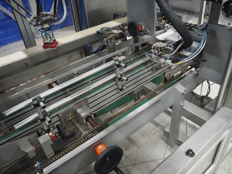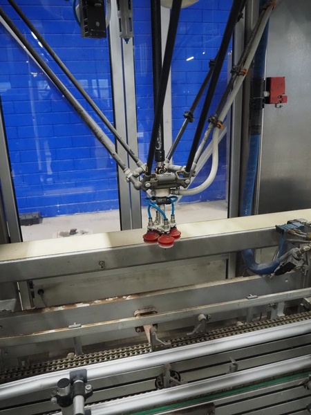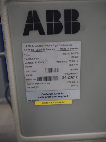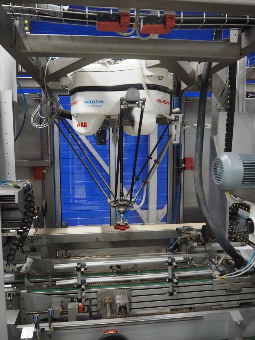 Altotek case erecting and filling machine with FlexPicker, machine number: 754867, year of construction: 31/01-2003, 400 V, 3 Ph, 50 Hz, 35 A, Nordson glue unit, minimum box sizes: 175 mm x 115 mm x 100 mm, maximum box sizes: 350 mm x 250 mm x 250 mm, s/s chain conveyor with dividers, belt width: 200 mm, distance between dividers: 350 mm, divider height: 50 mm, plastic belts, belt width: 130 mm, total dimensions: 4500 mm x 2000 mm x 2600 mm. With ABB control panel and cabinet for robot, type: IRB340 M2000, serial number: 34-20212, year of construction: 19-08-2002, dimensions: 900 mm x 550 mm x 1100 mm.