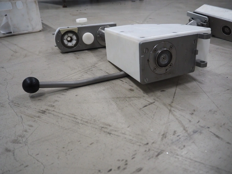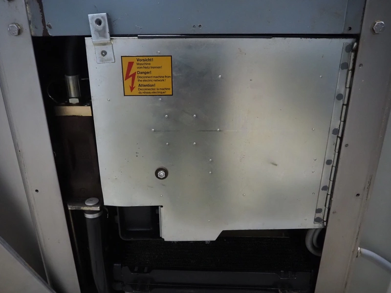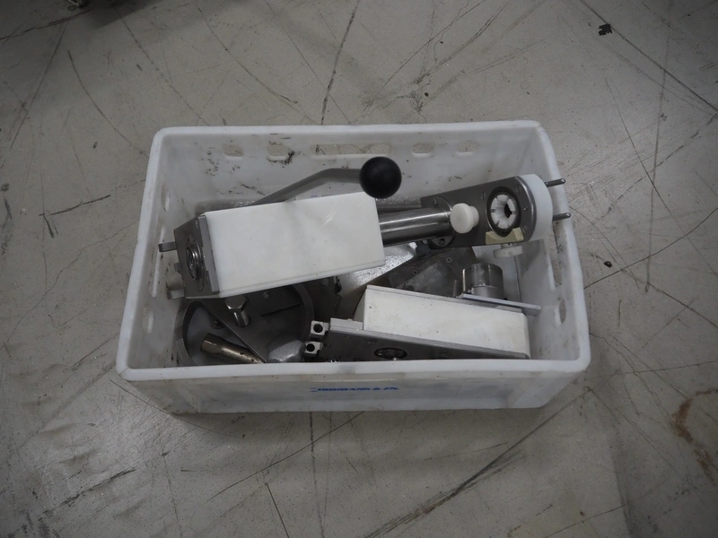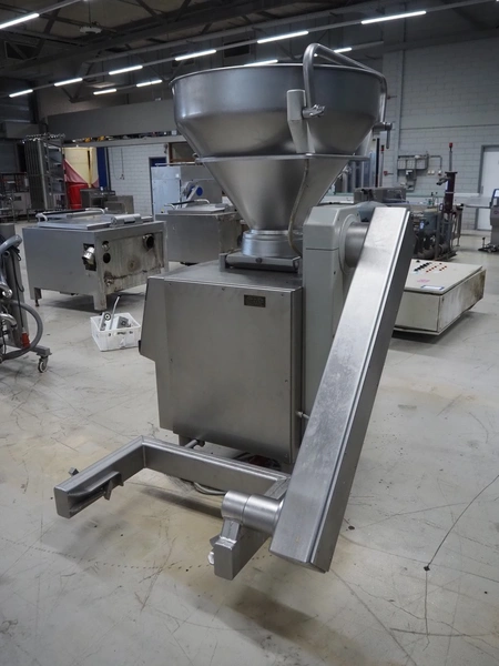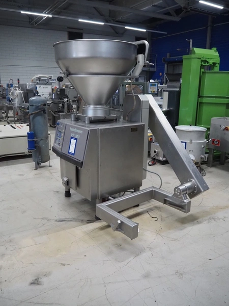 Handtmann vacuum filling machine with lifter for 200 liter meat bins and linking attachment, type: VF300B, number: 965, 380 V, 50 Hz, 23.6 A, 9.5 kW, numbers attachment: 34-4/1071 and 60-6/4898, Becker vacuum pump, type: U 1.16 SA-31, number: B1076841, capacity: 16 m³ per hour, dimensions: 1650 mm x 1250 mm x 2020 mm. Including crate with parts.