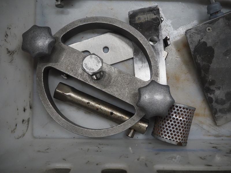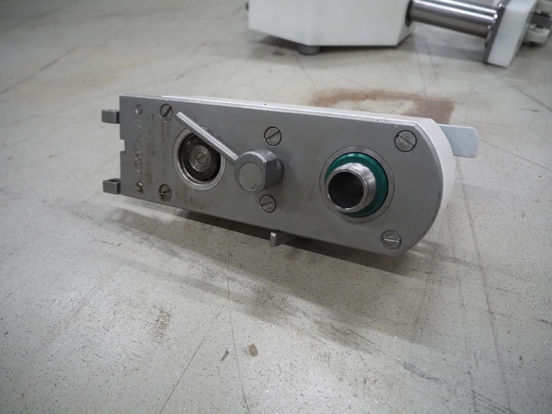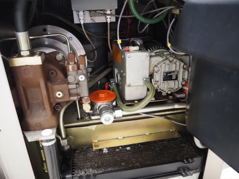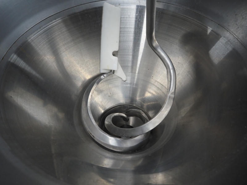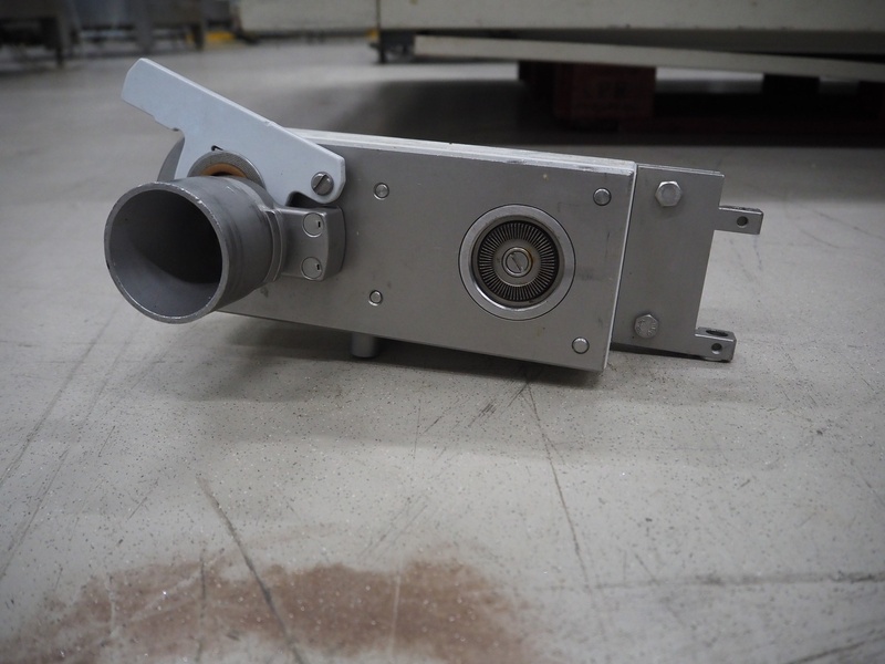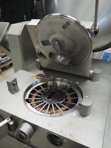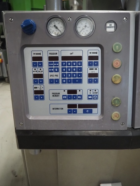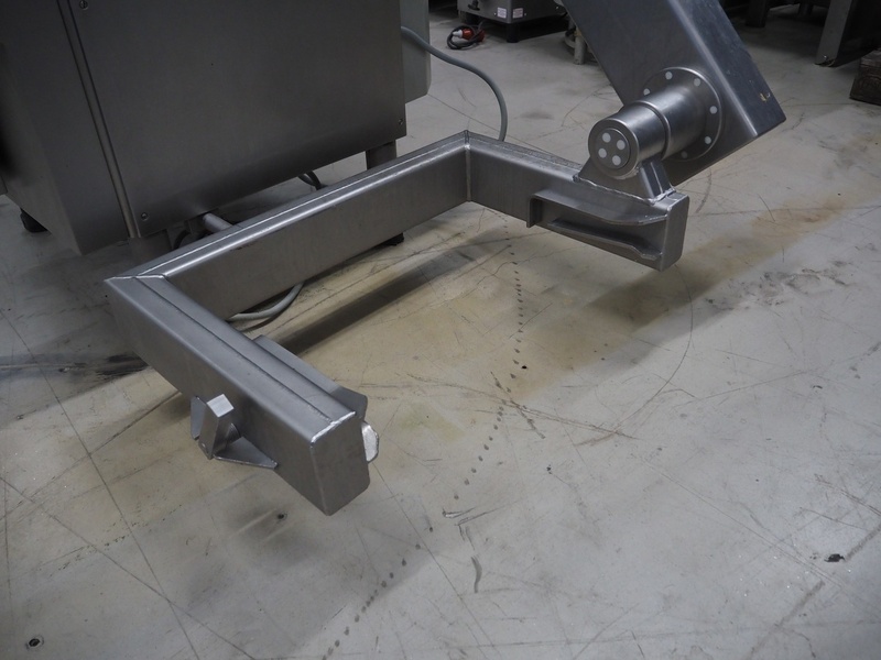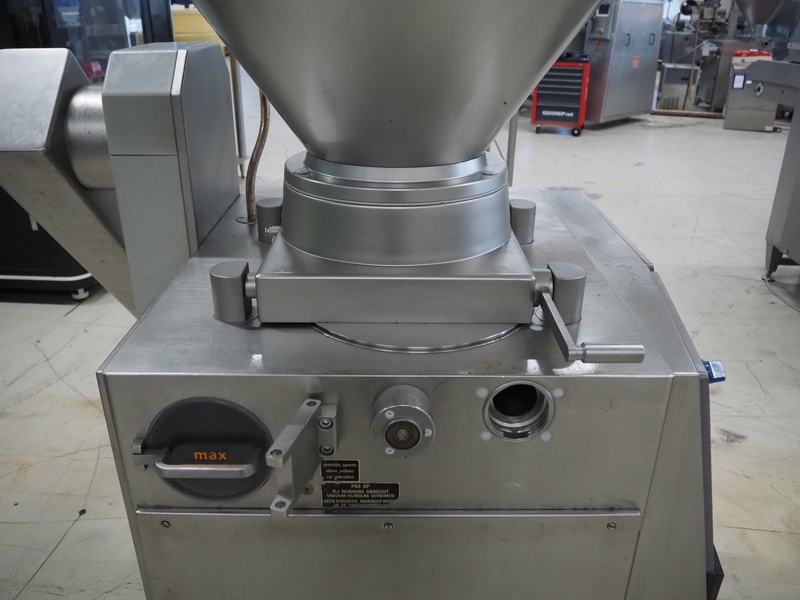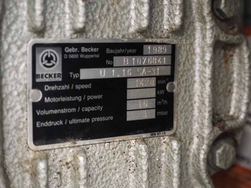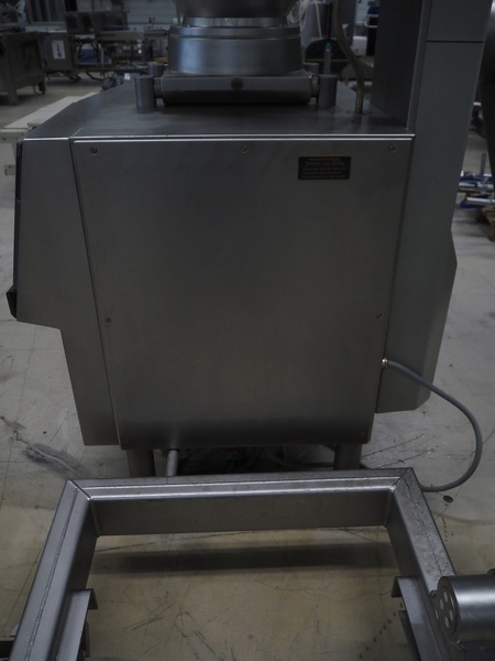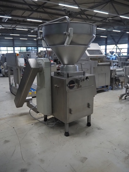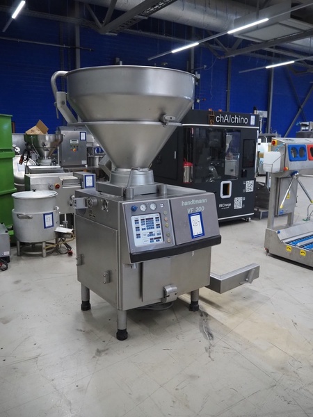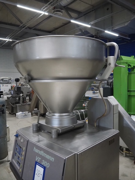 Handtmann vacuum filling machine with lifter for 200 liter meat bins and linking attachment, type: VF300B, number: 965, 380 V, 50 Hz, 23.6 A, 9.5 kW, numbers attachment: 34-4/1071 and 60-6/4898, Becker vacuum pump, type: U 1.16 SA-31, number: B1076841, capacity: 16 m³ per hour, dimensions: 1650 mm x 1250 mm x 2020 mm. Including crate with parts.