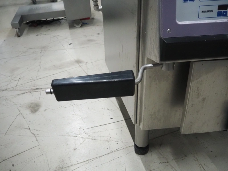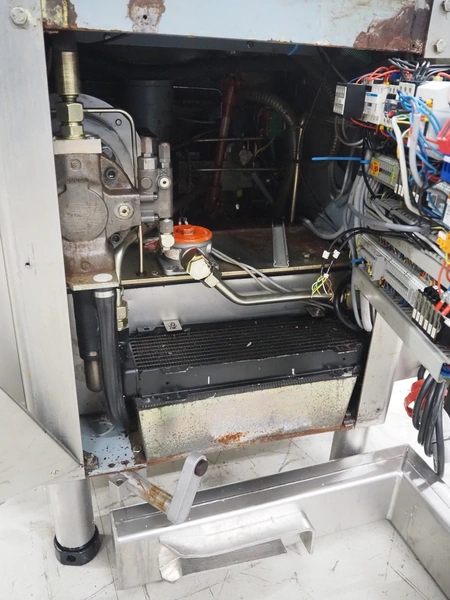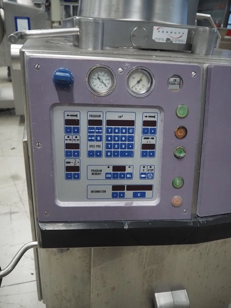 Handtmann vacuum filling machine with lifter for meat bins, type: VF300B, number: 2781, year of construction: 1997, 400 V, 50 Hz, 22.6 A, 9.5 kW, dimensions: 2150 mm x 1350 mm x 2000 mm. Incomplete, missing vacuum pump, rotor and veins.