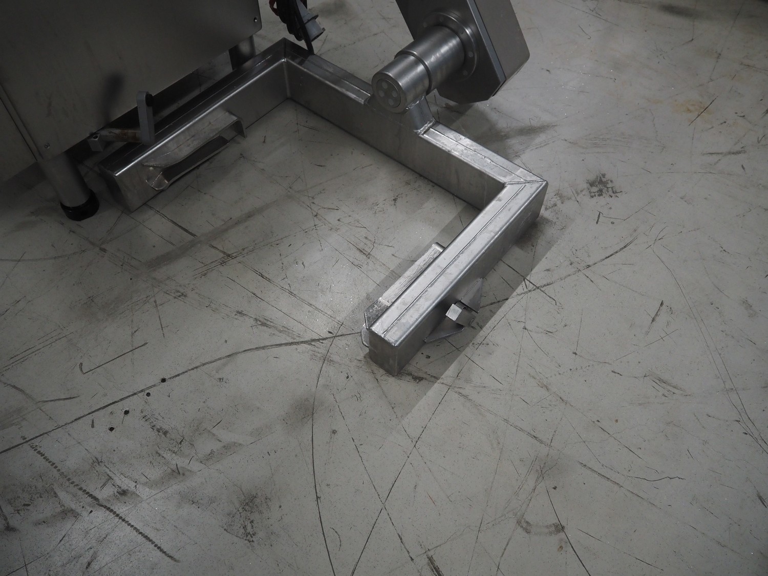 Handtmann vacuum filling machine with lifter for meat bins, type: VF300B, number: 2781, year of construction: 1997, 400 V, 50 Hz, 22.6 A, 9.5 kW, dimensions: 2150 mm x 1350 mm x 2000 mm. Incomplete, missing vacuum pump, rotor and veins.