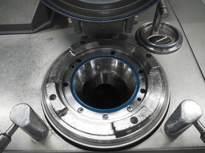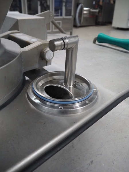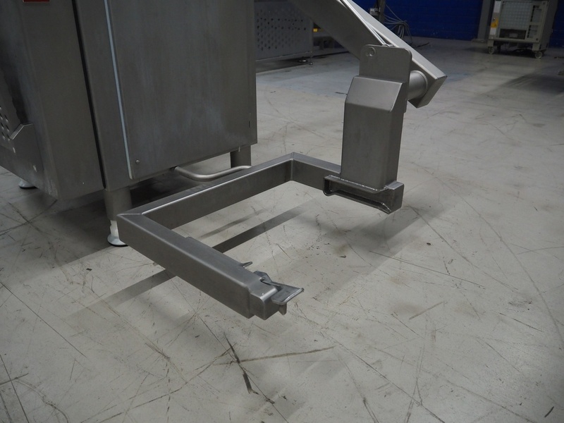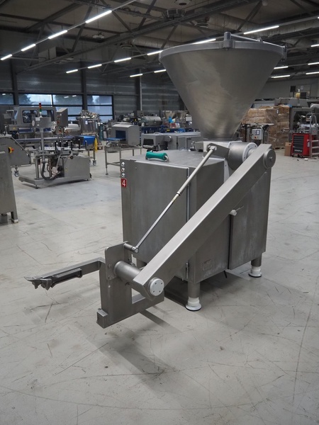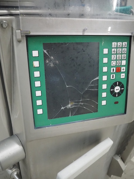 Vemag vacuum filling machine with lifter for meat bins, model: HP20E, number: 1630035, year of construction: 2007, 400-460/575 V, 3 Ph, 50/60 Hz, 31/35/29 A, 25 kW, dimensions: 2200 mm x 1400 mm x 2150 mm. Incomplete, screen broken, technical condition unknown.
