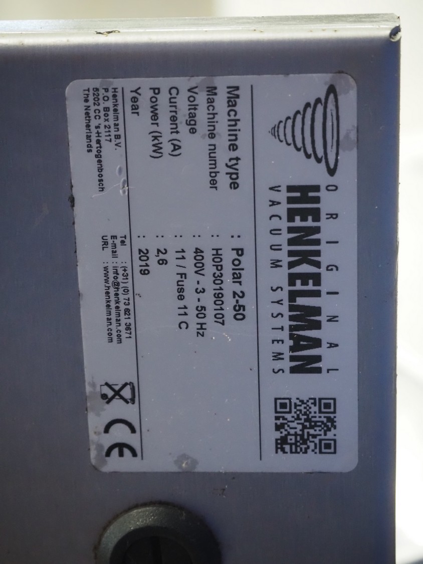 Henkelman mobile double chamber vacuum machine, type: Polar 2-50, machine number: H0P30190107, year of construction: 2019, 400 V, 3 Ph, 50 Hz, 11 A, 2.6 kW, Busch vacuum pump, type: RA 0100 F 5R3, serial number: DEM119290234, year of construction: 2019, capacity: 100 m³ per hour, seal width: (2x) 620 mm, dimensions chamber: 680 mm x 650 mm, total dimensions: 1500 mm x 1000 mm x 1050 mm.