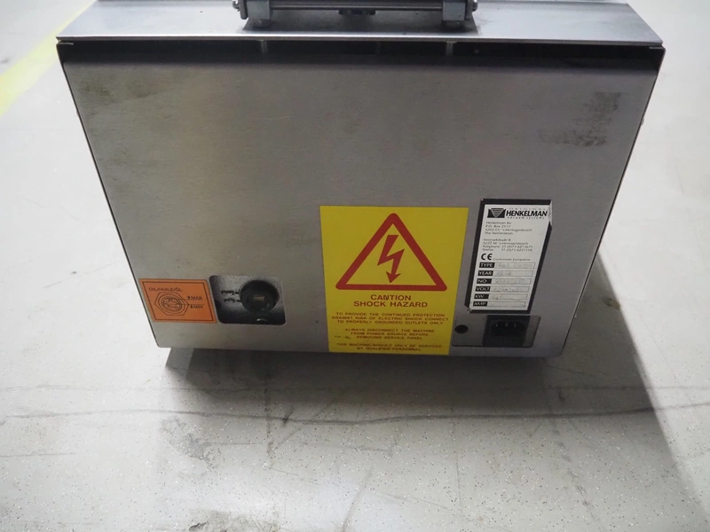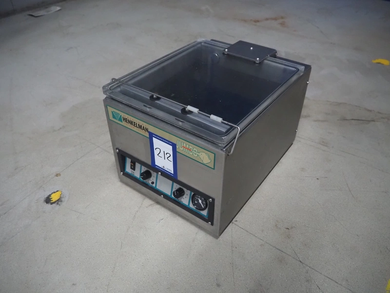 Henkelman vacuum machine, type: Mini Jumbo, number: 00207317, year of construction: 2002, 230 V, 1 Ph, 50 Hz, 3 A, 0.6 kW, chamber dimensions: 280 mm x 270 mm, seal length: 275 mm, total dimensions: 400 mm x 335 mm x 300 mm.