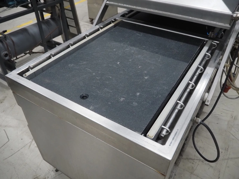 Röscherwerke GmbH mobile double chamber vacuum machine, type: VM-61/2/C, number: 6311007, year of construction: 06/99, 230/400 V, 50 Hz, 6.2 kW, weight: 640 kg, seal length: (4x) 860 mm, chamber: (2x) 880 mm x 640 mm, Busch vacuum pump, type: RA 0250 D 561 QMZZ, number: C9920000012, capacity: 250 m³ per hour, total dimensions: 1950 mm x 920 mm x 1100 mm.
